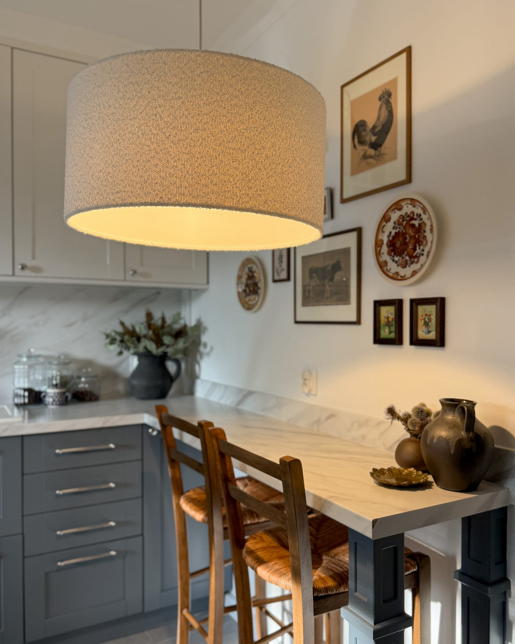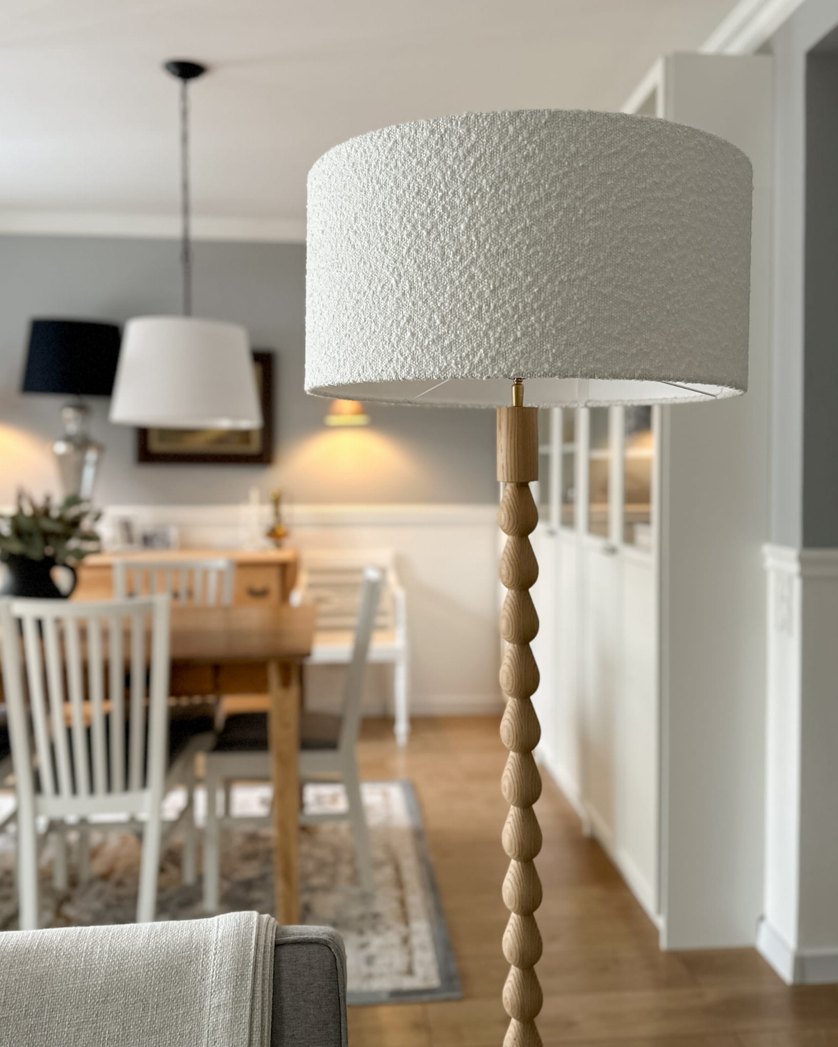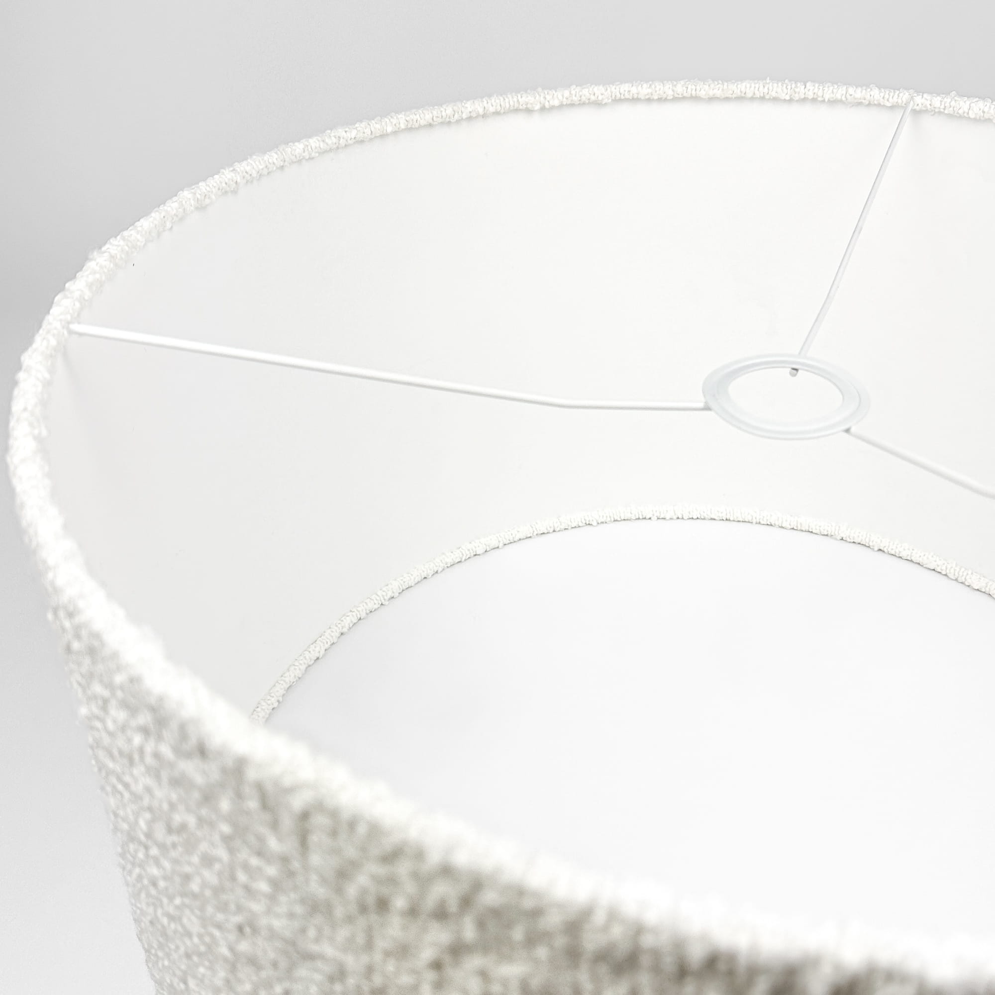 - Przytulna tkanina bouclé o wyraźnym splocie w lekko złamanym odcieniu bieli połączona z białym, matowym wnętrzem abażura.