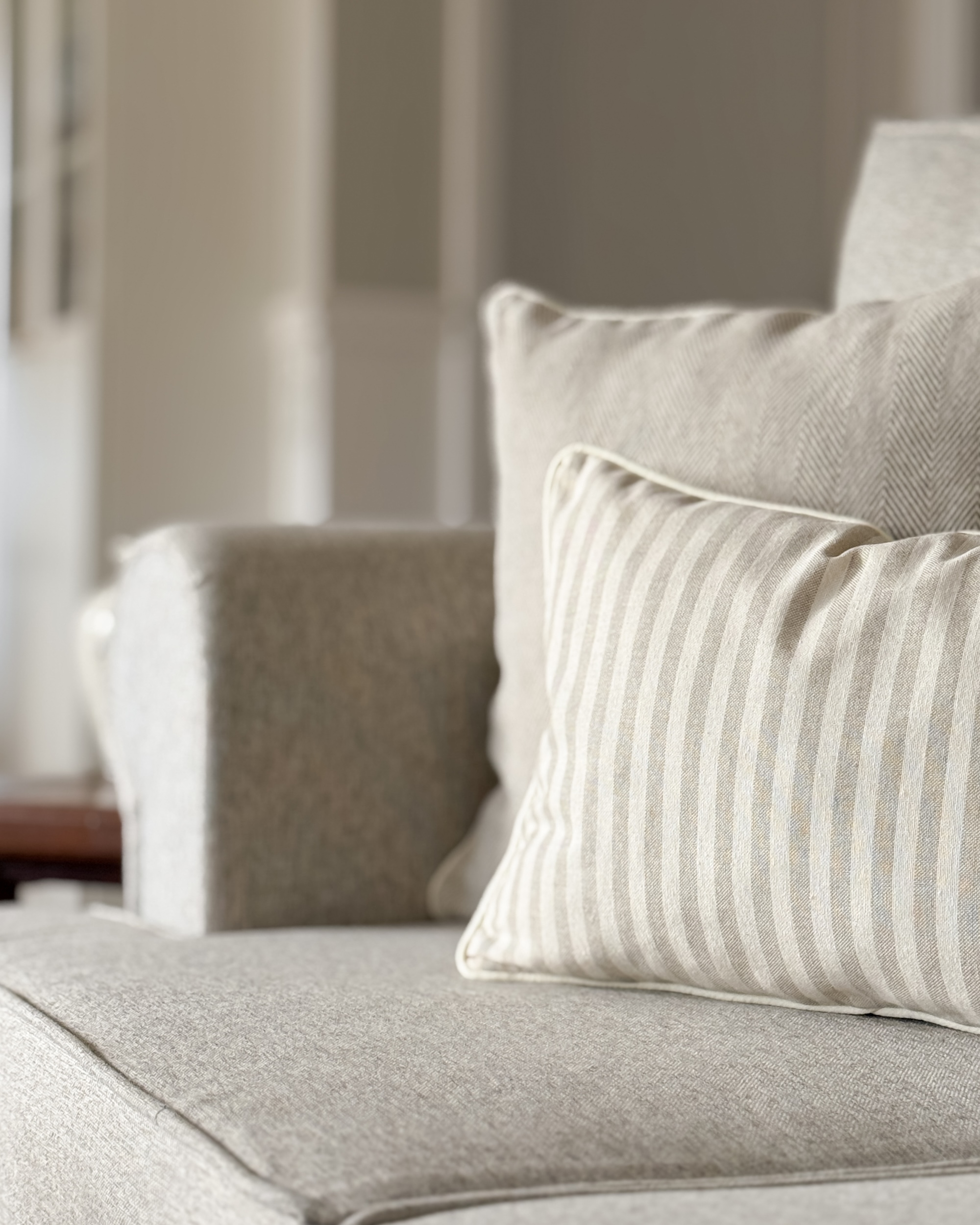 - Ponadczasowy, tkany wzór pasków w odcieniach beżu i kremu.