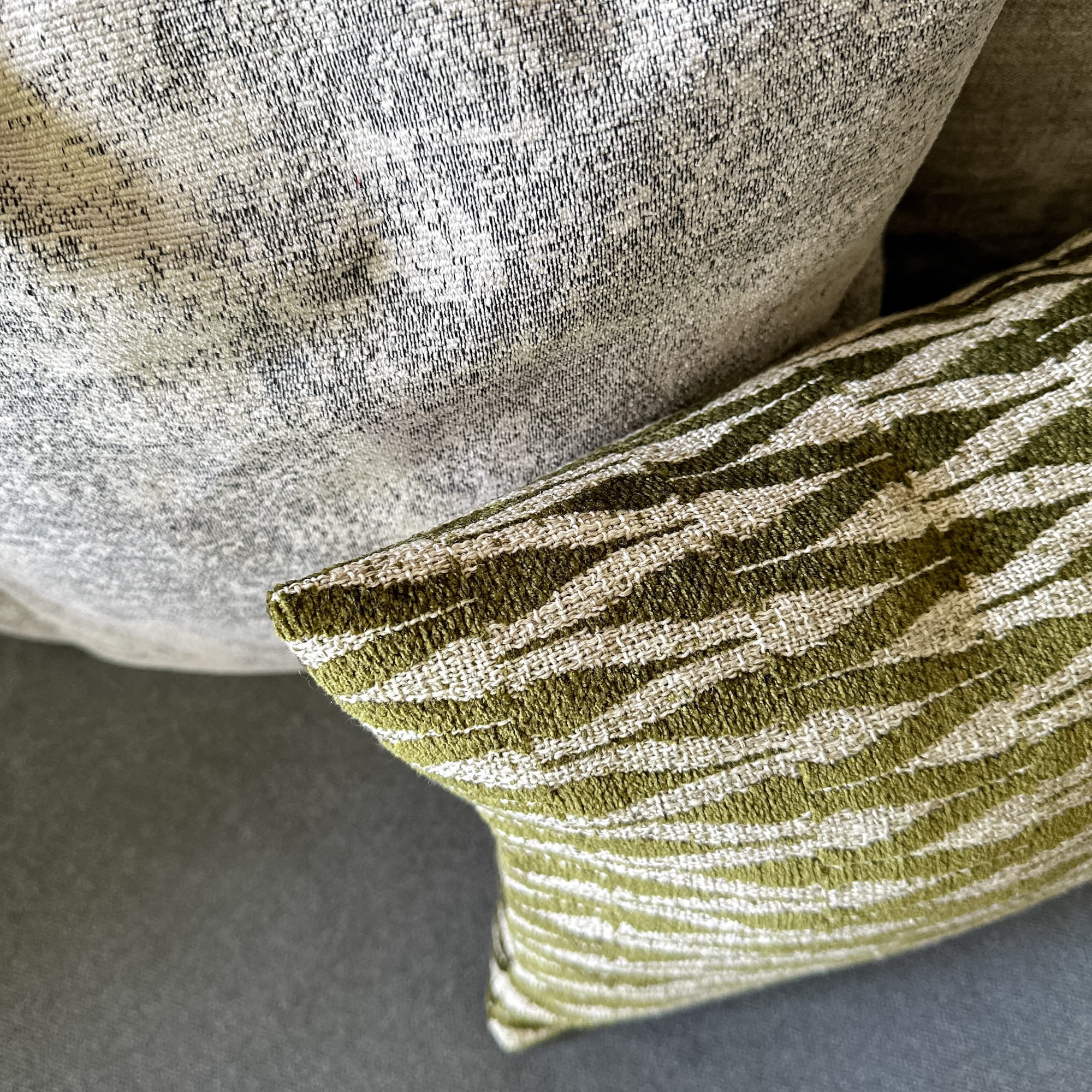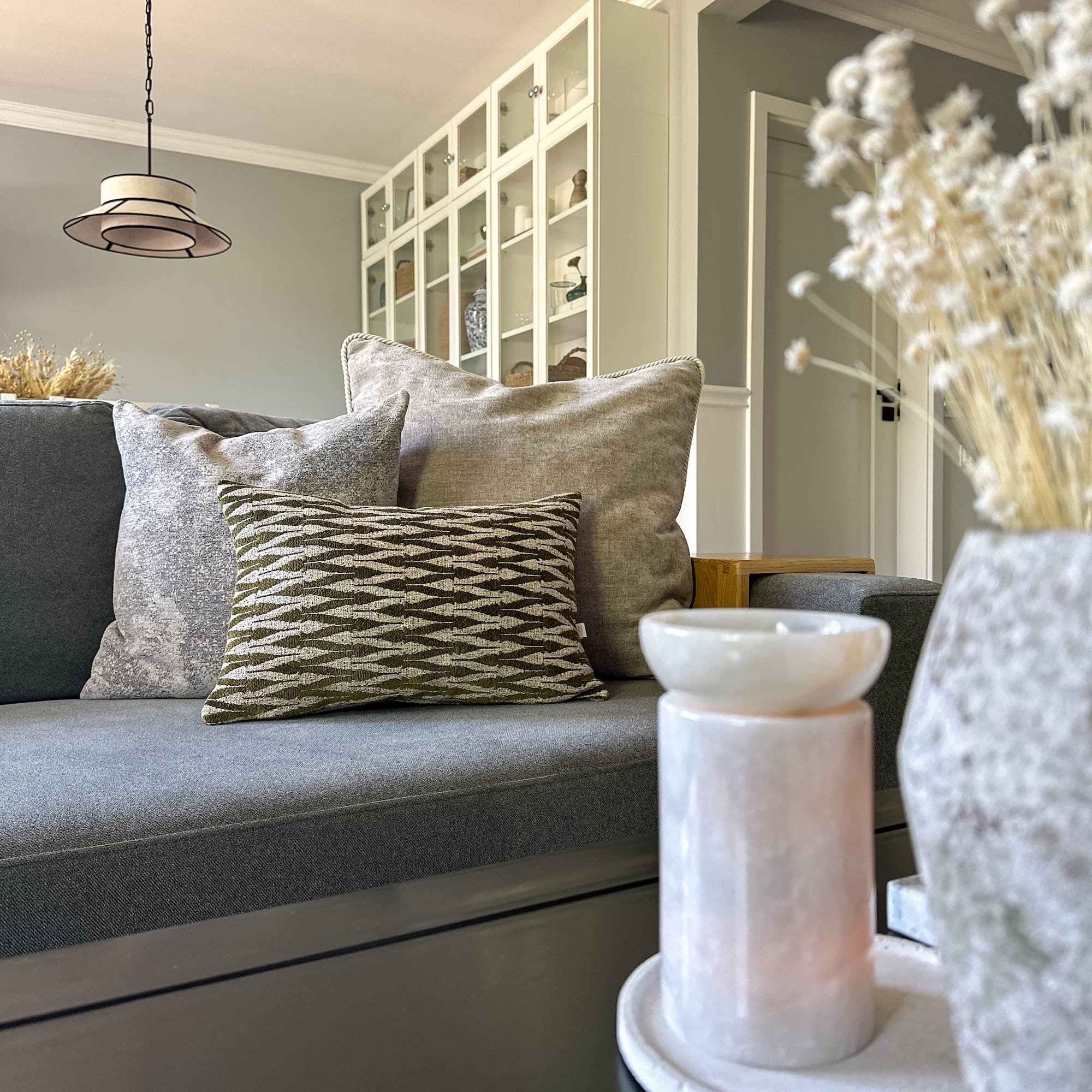Beżowo-zielony zestaw poszewek No. 12 zachwyca różnorodnością struktur i wzorów. A to wszystko w stonowanych kolorach, nieprzytłaczających wnętrza! Z jednej strony znajdziesz tu stonowane odcienie beżu w największej poduszce PUCH i średniej VINTAGE. Z drugiej strony całą kompozycję świetnie przełamuje najmniejsza poduszka VERSO III. Wyraźny wzór i przygaszony odcień zieleni są "kropką nad i" w tej kompozycji. Cały zestaw poszewek No. 12 wprowadza do wnętrza przytulny klimat w eleganckim wydaniu.