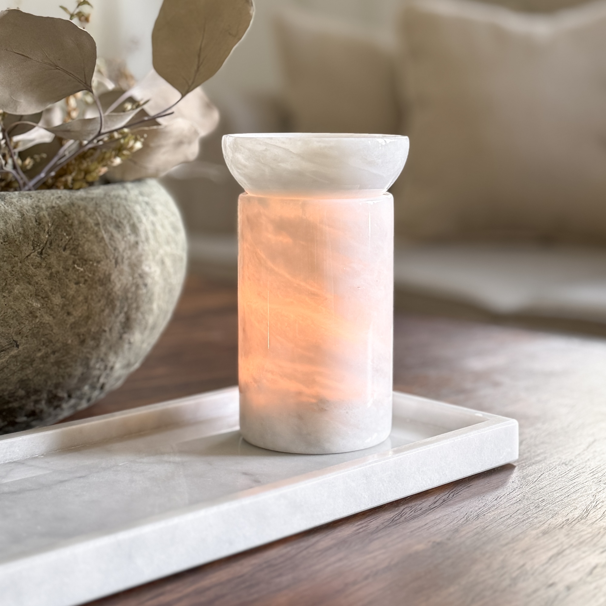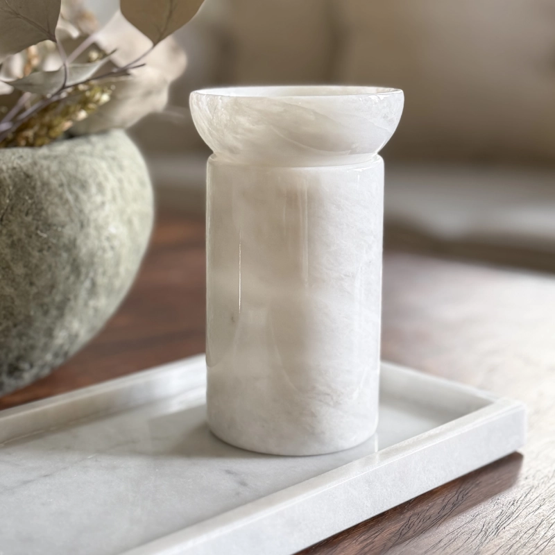 Biały kominek zapachowy MARBEA to ponadczasowy dodatek do każdego wnętrza - zarówno na jesień i zimę, jak też przyjemne, letnie wieczory. Kominek na wosk zapachowy został wykonany w całości z naturalnego kamienia - marmuru w klasycznym, białym kolorze z szarymi żyłkami. Ten naturalny materiał zachwyca swoją strukturą łączącą różne odcienie bieli z i szarości we wzorze charakterystycznym dla marmuru. Masz pewność, że Twój kominek zapachowy jest jedynym takim egzemplarzem na całym świecie! Warto podkreślić, że estetyka łączy się tutaj z funkcjonalnością, ponieważ miseczkę na wosk w marmurowym kominku zapachowym możesz swobodnie wyjąć, co znacznie ułatwia usuwanie wosku i czyszczenie kominka.