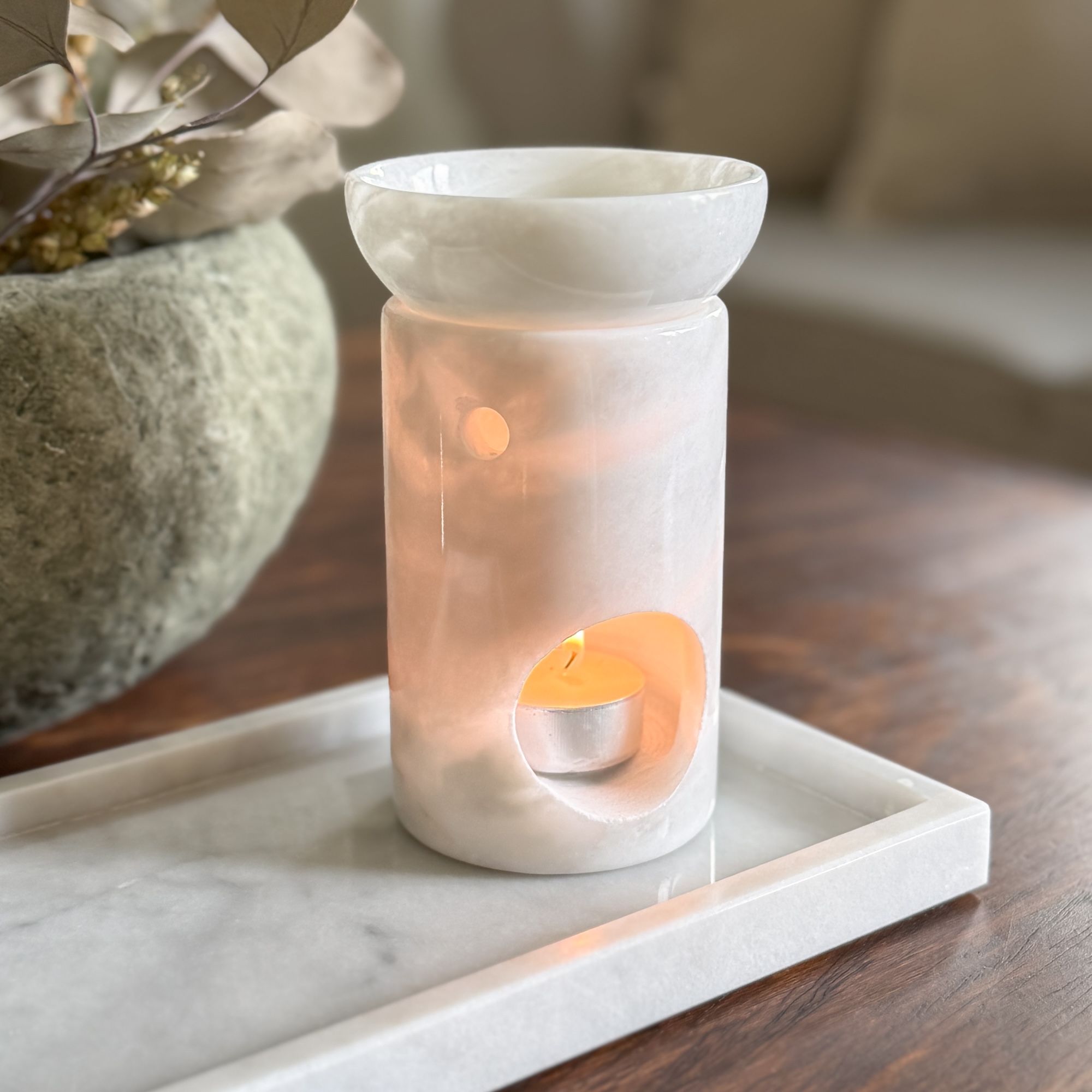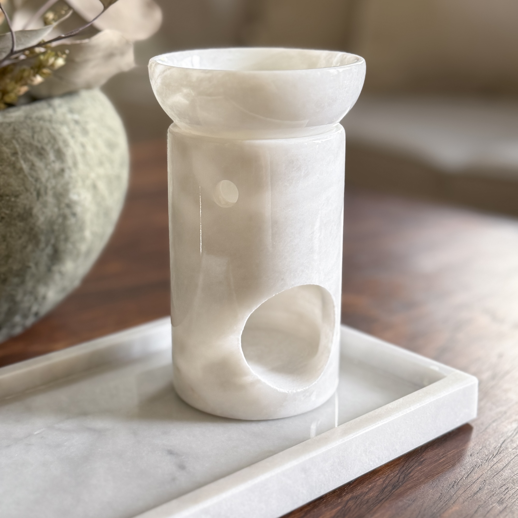- Kominek zapachowy wykonany z naturalnego kamienia - marmuru w klasycznym, białym kolorze z szarymi żyłkami i smugami.