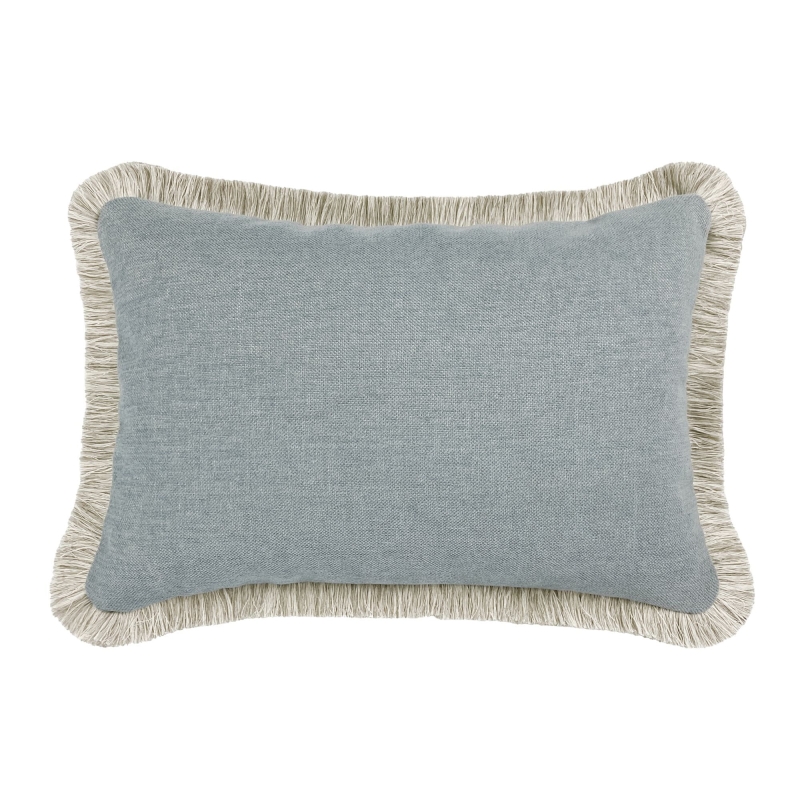 - Poszewka z błękitnoszarej tkaniny szenilowo-żakardowej z delikatnym splotem, obszyta gęstymi frędzlami bawełnianymi w naturalnym, szarobeżowym odcieniu.