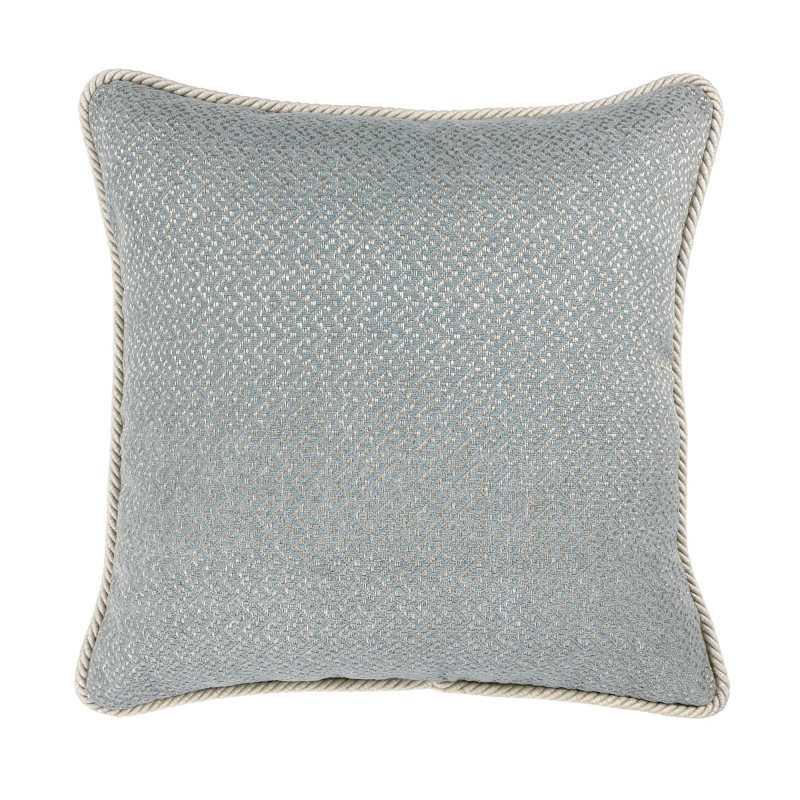 - Poszewka z błękitnoszarej tkaniny szenilowo-żakardowej z delikatnym, połyskującym wzorem, obszyta grubym, bawełnianym sznurem w naturalnym, szarobeżowym odcieniu.