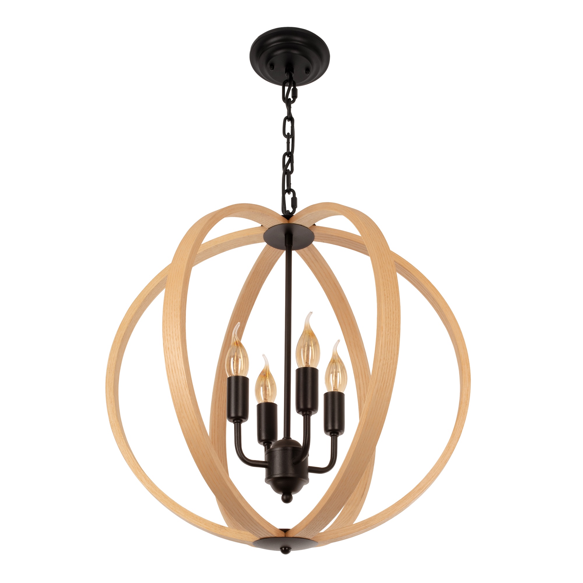 Kulista lampa wisząca MOON wprowadzi do Twojego wnętrza ciepły, rustykalny klimat. Sercem tej lampy jest metalowa konstrukcja z 4 punktami świetlnymi w kształcie nawiązującym do ozdobnych świeczników. A to nie wszystko, bo w całej konstrukcji znajdziesz wiele dekoracyjnych detali, będących efektem rzemieślniczego wykonania. Całość jest zamknięta w drewnianym kloszu w kształcie kuli, stworzonej z drewnianych, giętych łuków. Dzięki tak ponadczasowemu połączeniu materiałów, to lampa wisząca idealna do wnętrz klasycznych, rustykalnych i stylu farmhouse. Lampa MOON świetnie sprawdzi się jako oświetlenie salonu, kuchni lub sypialni, jak też oświetlenie korytarza, będąc nie tylko funkcjonalna, ale i dekoracyjna.