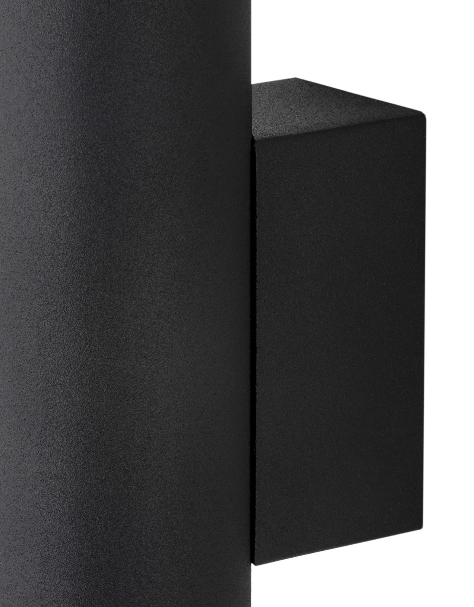 - Prosty kinkiet w kształcie tuby wykonany ze stali polakierowanej na kolor czarny z widoczną strukturą.