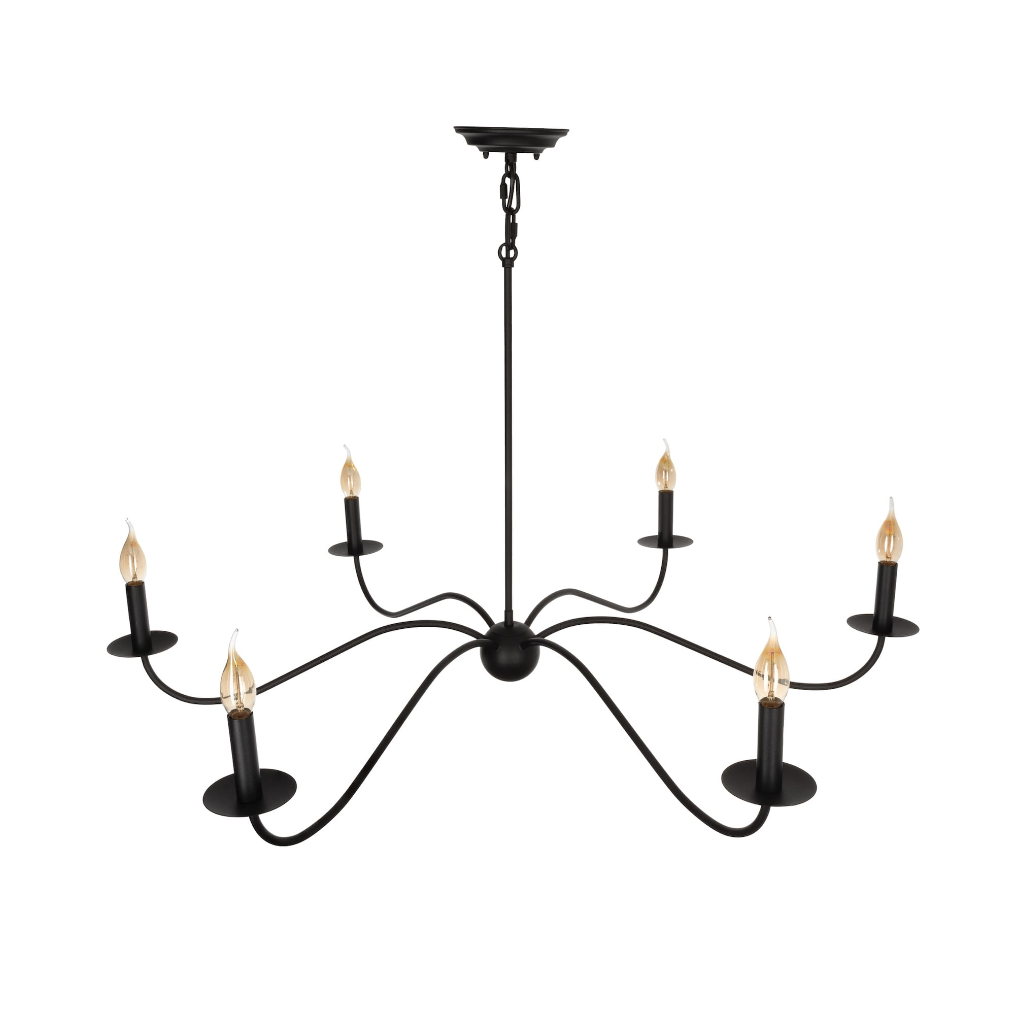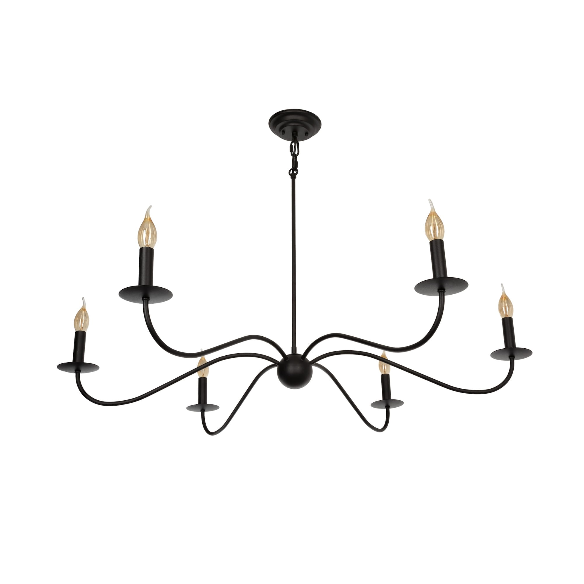 Czarny żyrandol z kolekcji ELEGANT to wyjątkowe oświetlenie to Twojego wnętrza. Elegancka, gięta konstrukcja wyróżnia się dużą średnicą, a jednocześnie optyczną lekkością. Całości dopełniają oprawki, które w połączeniu z żarówkami w kształcie płomyków, przypominają klimatyczne świeczniki.