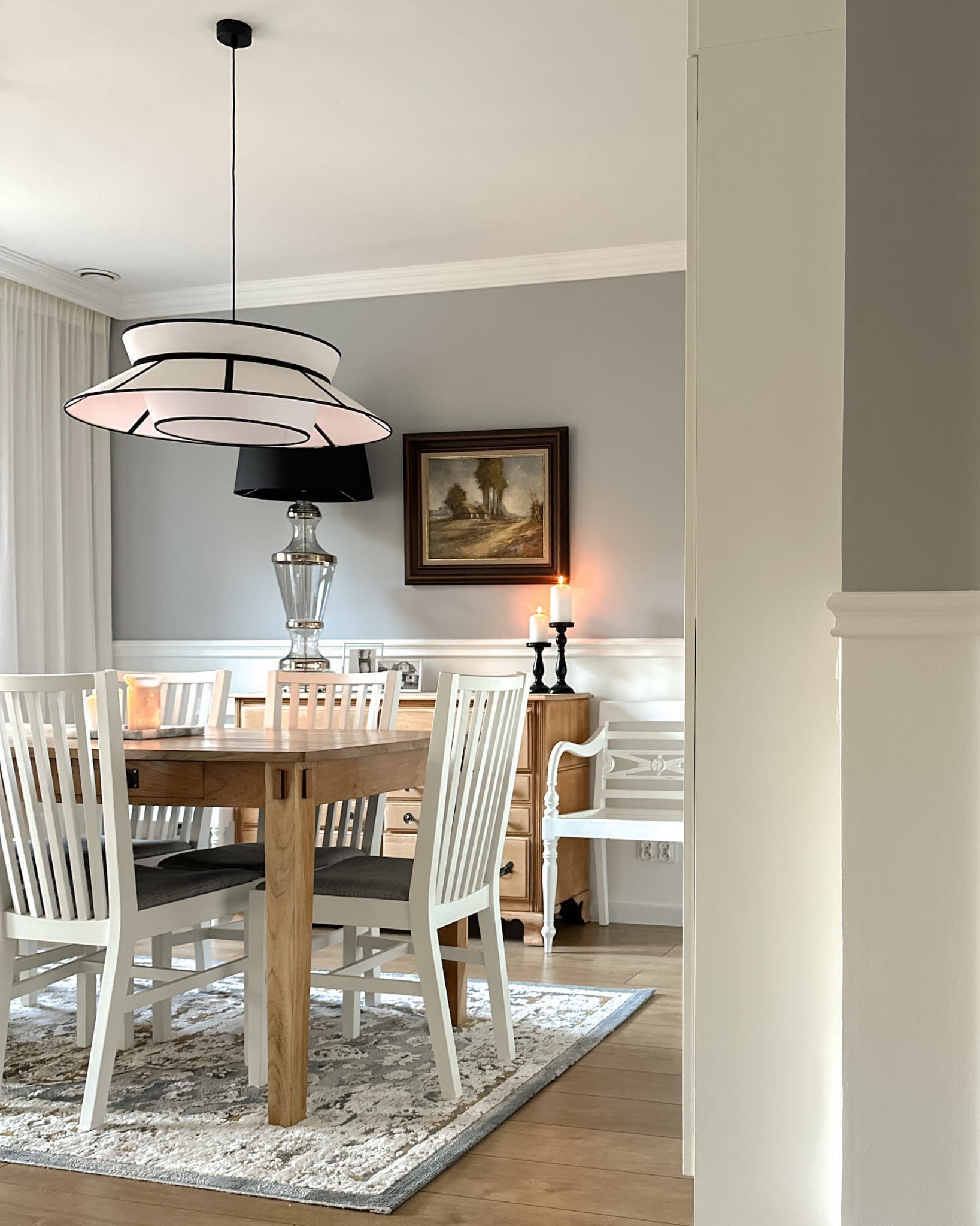- Klasyczne połączenie naturalnej bawełny w odcieniu złamanej bieli wykańczającej każdą powierzchnię abażura z czarnymi akcentami w formie ozdobnych tasiemek.