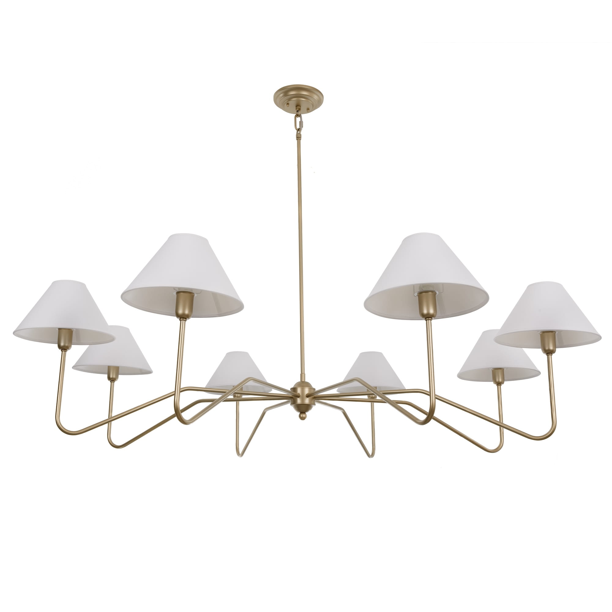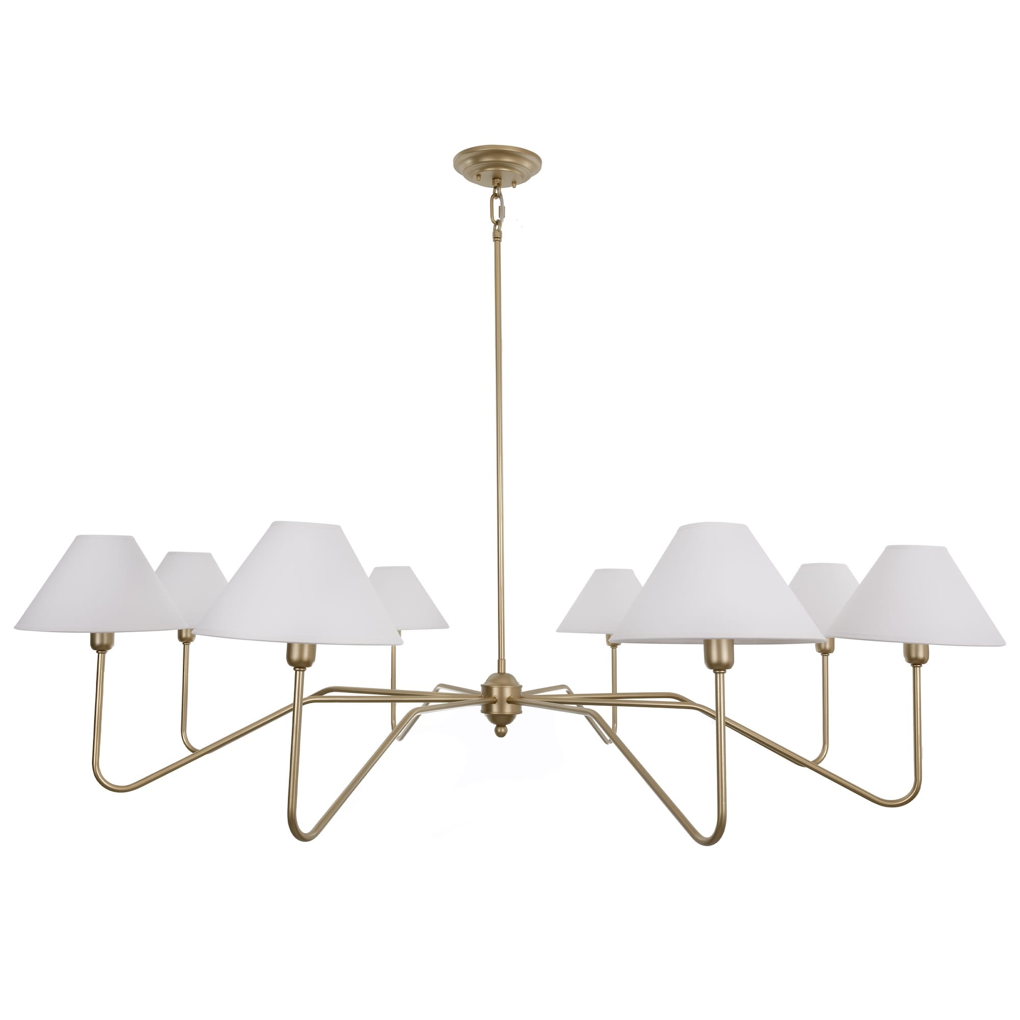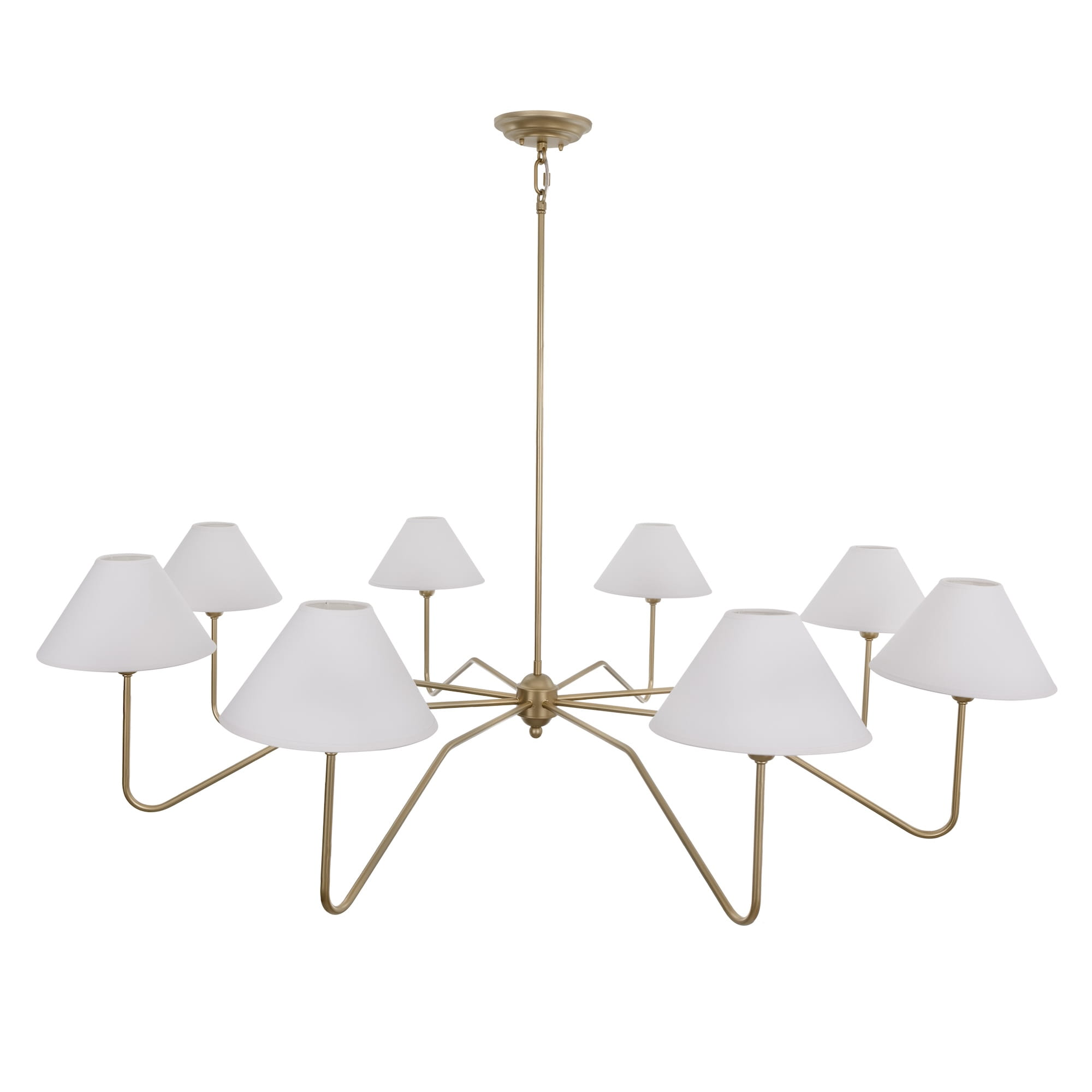Duży złoty żyrandol z kolekcji SIMPLE to oświetlenie w klasycznym, nieprzemijającym stylu. Gięta konstrukcja żyrandola w eleganckim, stonowanym odcieniu złota wprowadza do wnętrza elegancję. Jednocześnie żyrandol ten wyróżnia się optyczną lekkością mimo dużej średnicy, dzięki czemu nie przytłacza wnętrza. 8 punktów świetlnych ze stożkowymi abażurami oświetla przestrzeń przyjemnym, miękkim światłem.