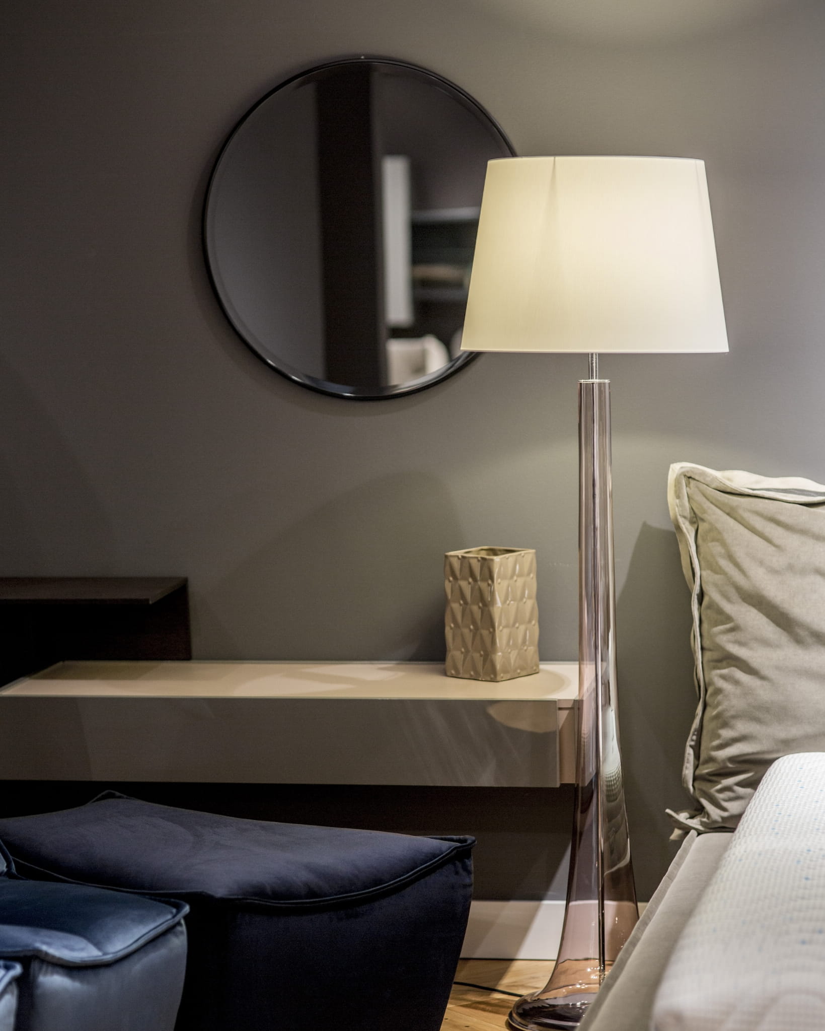 - Elegancka lampa podłogowa, która wprowadzi nastrojowe oświetlenie w salonie, sypialni, jak też gabinecie lub kąciku czytelniczym.