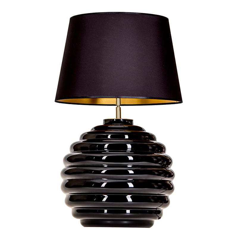 - Dopasowany stożkowy abażur z czarnej tkaniny ze złotym wnętrzem, zapewniający nastrojowe światło.