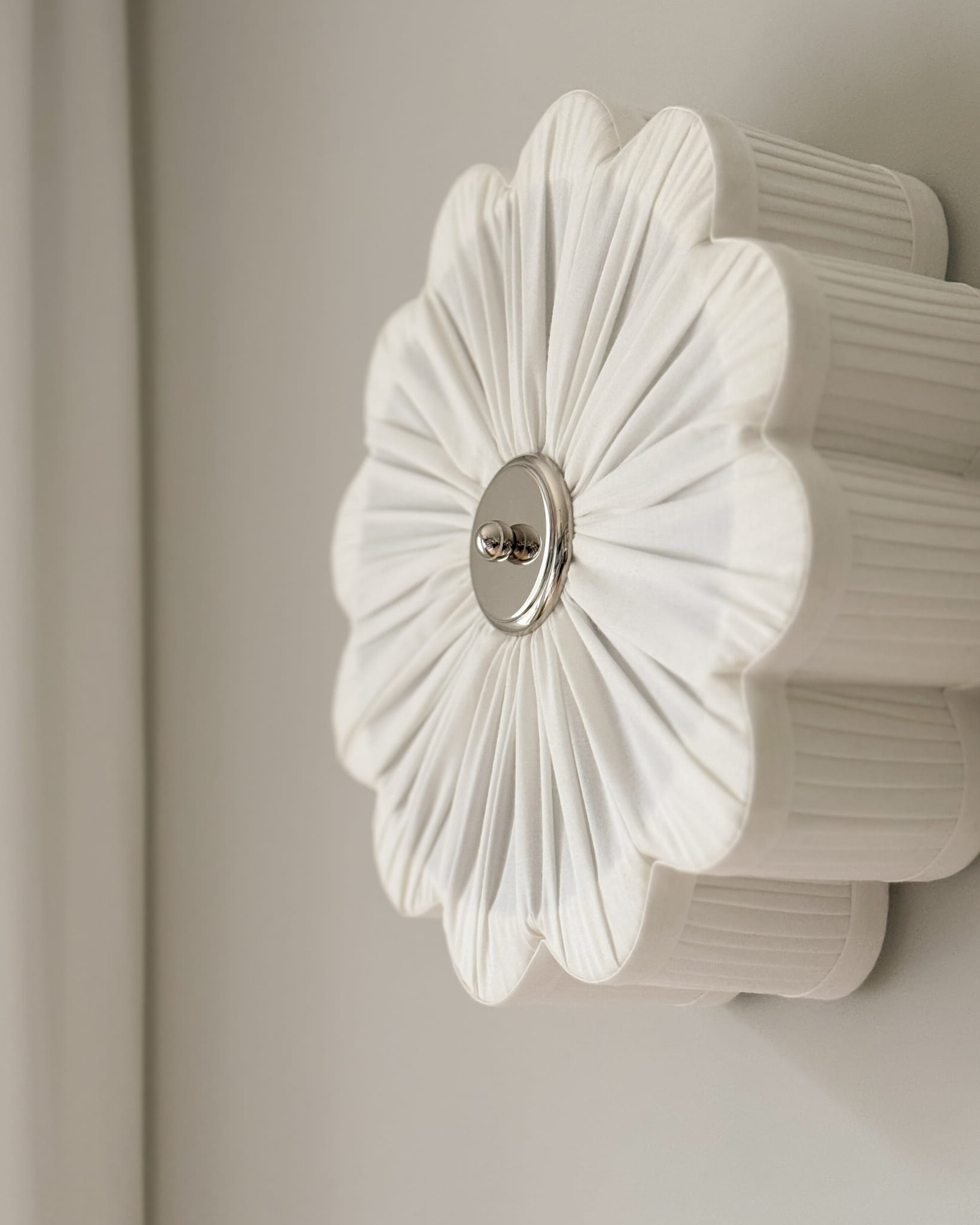 Dekoracyjność nie wyklucza przy tym funkcjonalności. Dopracowana konstrukcja pozwala na zastosowanie lamp PEONIA w formie plafonu, jak również kinkietu, co daje ogromne możliwości aranżacyjne. Prosty sposób mocowania abażura do oprawy lampy sprawia, że łatwo utrzymać ją w czystości. Wystarczy przyłożyć abażur do magnesów w metalowej oprawie, które utrzymają go na miejscu lub analogicznie odsunąć abażur od nich, aby go zdjąć. Wyselekcjonowana tkanina bawełniana w odcieniu śmietankowej bieli zapewnia idealnie rozproszone światło, które wydostaje się z lampy przez każdą część abażura oraz delikatnie doświetla ścianę.