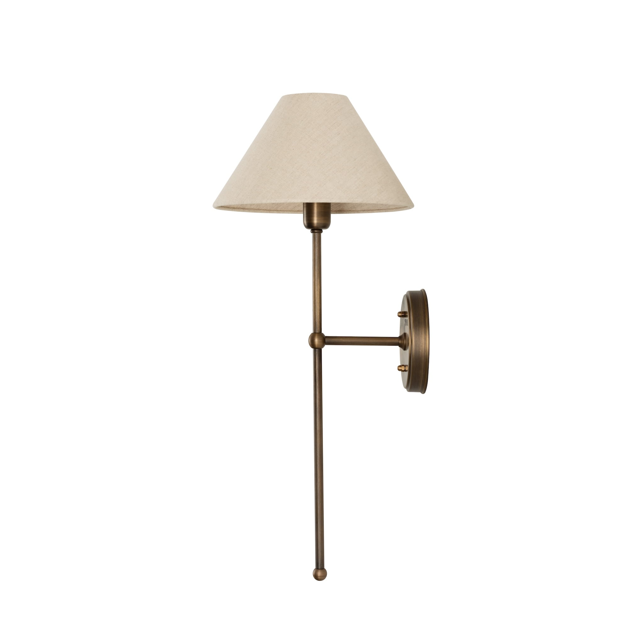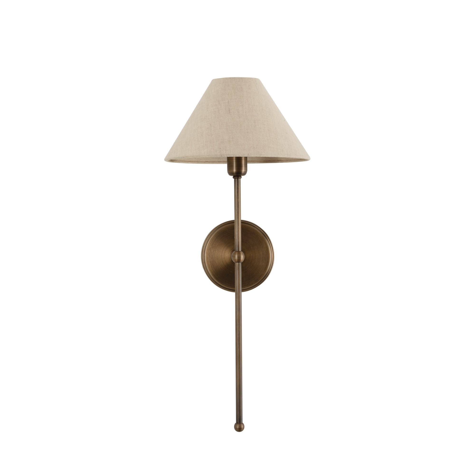 Mosiężny kinkiet z abażurem z kolekcji BASIC to klasyczne oświetlenie ścienne. Smukła forma oraz prosta przyściennica tworzą eleganckie zestawienie z lnianym abażurem w kształcie stożka. Postarzane wykończenie mosiężnej konstrukcji dodaje całości charakteru minionej epoki. Mosiężny kinkiet z abażurem zapewni klimatyczne światło jako oświetlenie boczne w różnorodnych wnętrzach.