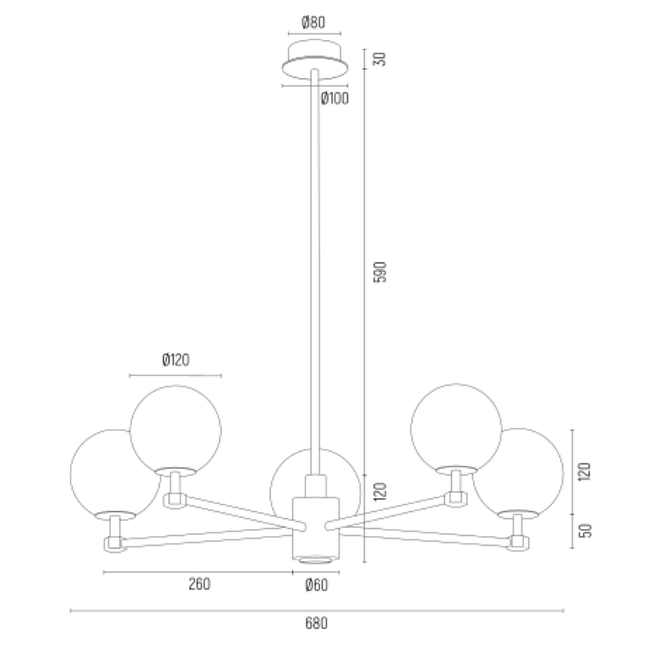 - 5 punktów świetlnych z kulistymi kloszami z mlecznego szkła ryflowanego.