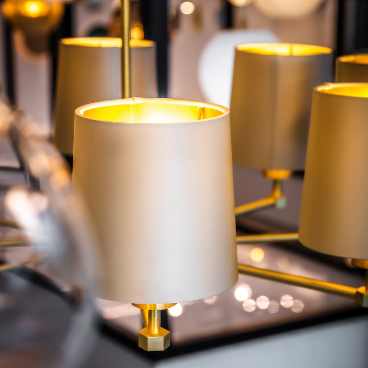 - 8 punktów świetlnych z klasycznymi, stożkowymi abażurami z beżowej satyny ze złotym wnętrzem.