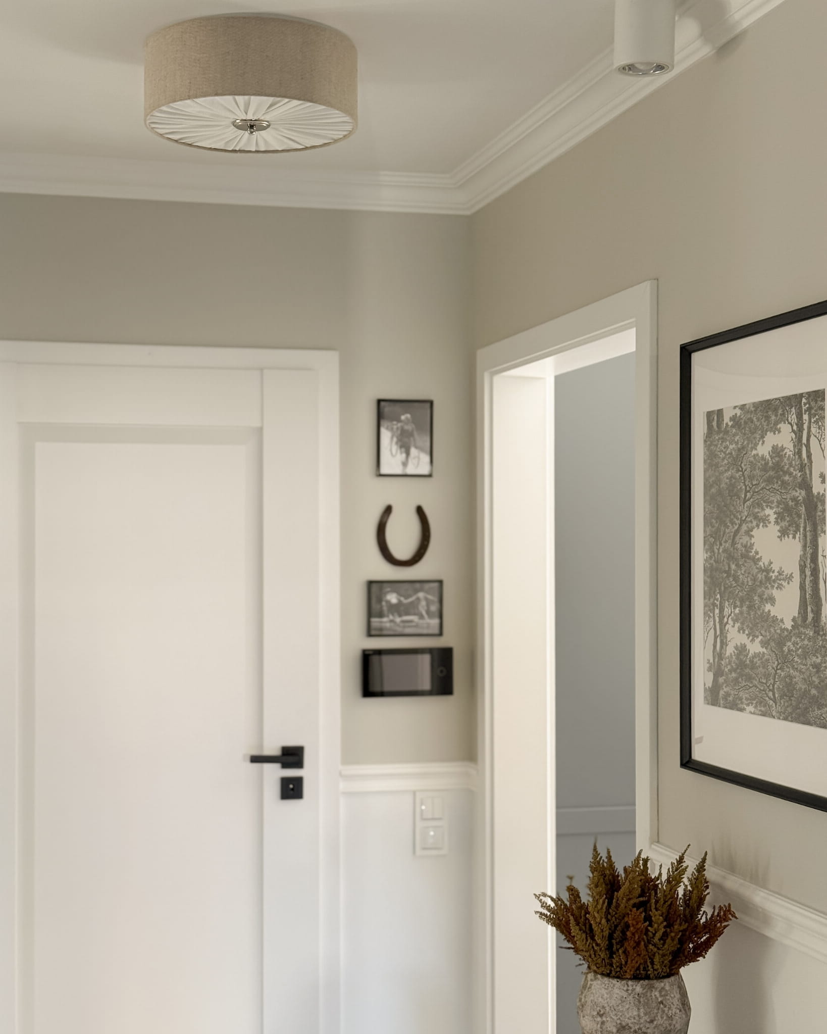 - Elegancki abażur z naturalnej tkaniny lniano-bawełnianej zapewniający przytulne, miękkie światło