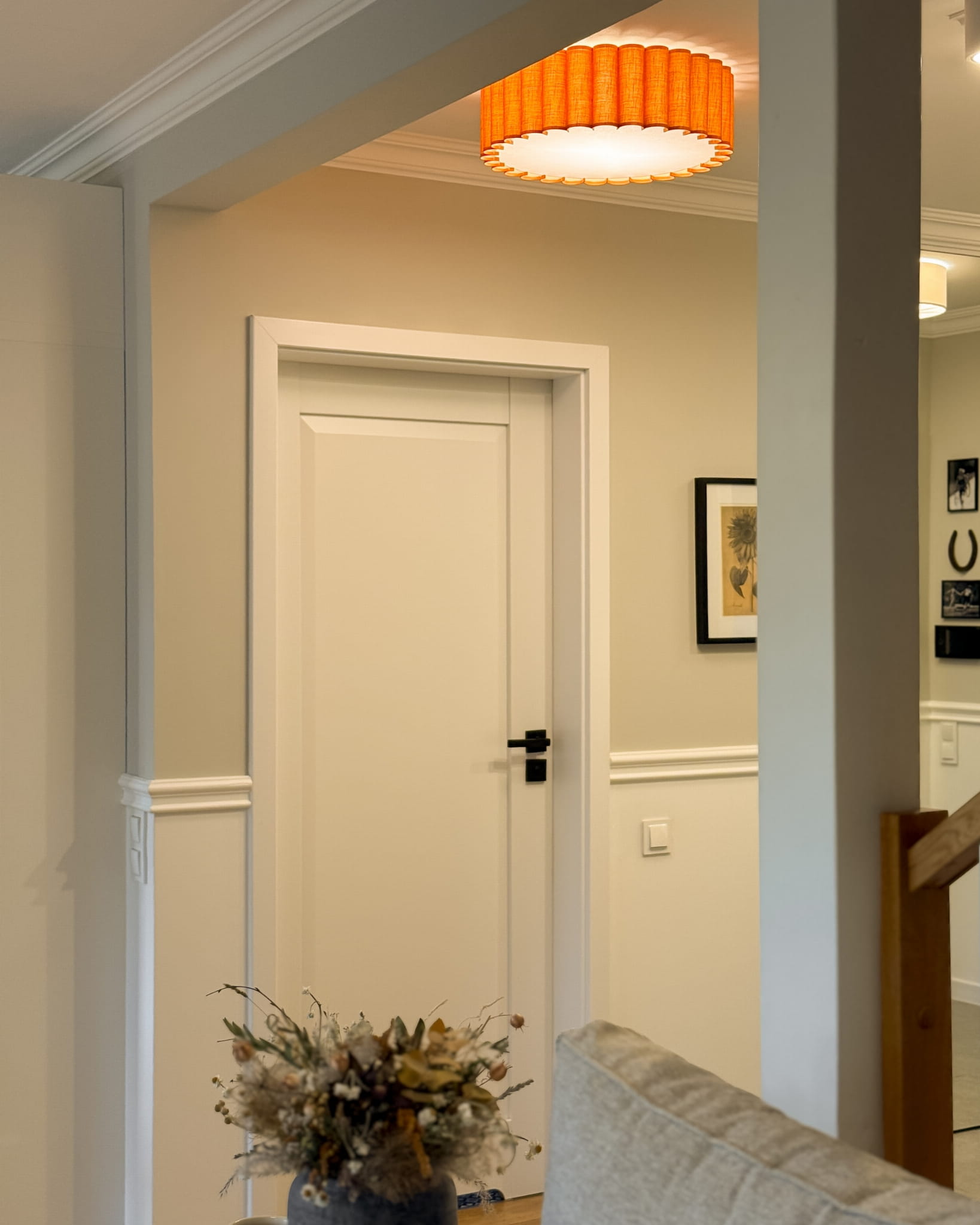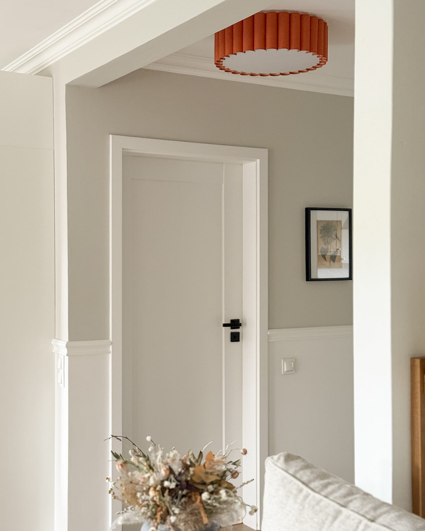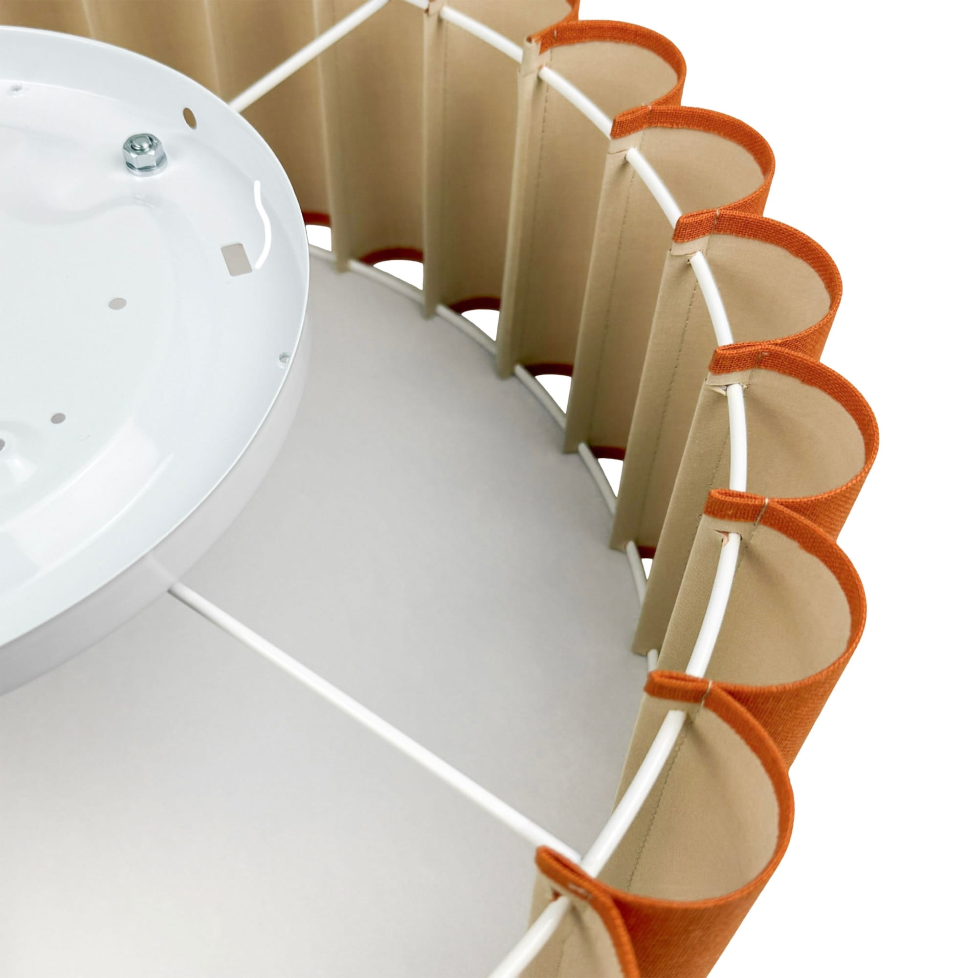 Nie zapominajmy jednak o funkcjonalności. Plafon ONDE wyróżnia się niezwykle prostym sposobem montażu abażura, ułatwiającym czyszczenie lampy. Wystarczy przyłożyć abażur do magnesów w metalowej oprawie, które utrzymają go na miejscu lub analogicznie odsunąć abażur od nich, aby go zdjąć. Ponadto pomarańczowy abażur z wyraźnym splotem wykończyliśmy od wewnątrz jasnobeżową, delikatną bawełną, a konstrukcję uzupełniliśmy o pergaminową blendę. Dzięki temu lampa ONDE zapewnia niesamowicie ciepłe światło z widoczną strukturą tkaniny. Przytulność i oryginalność gwarantowana!