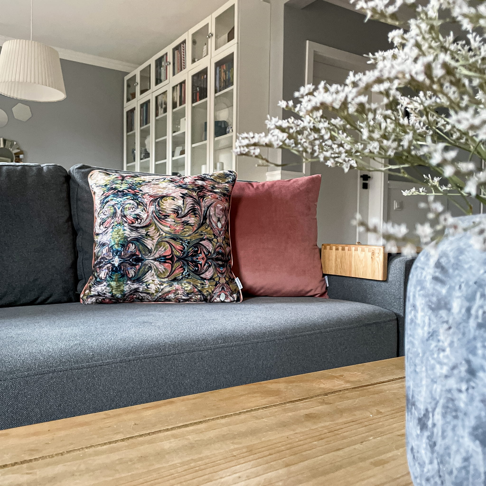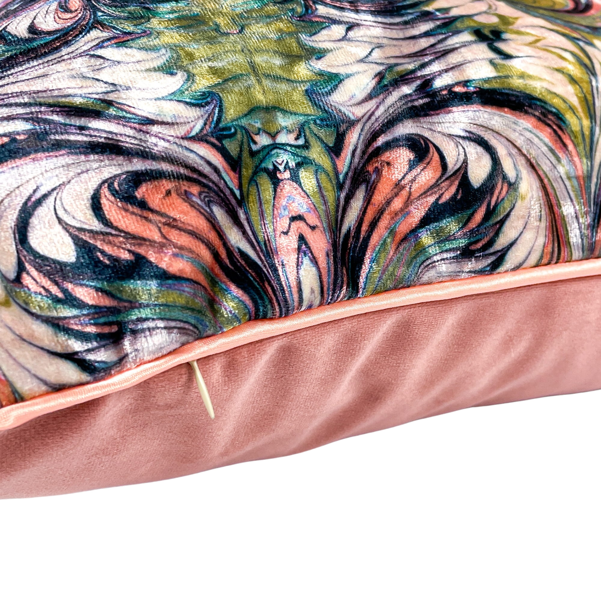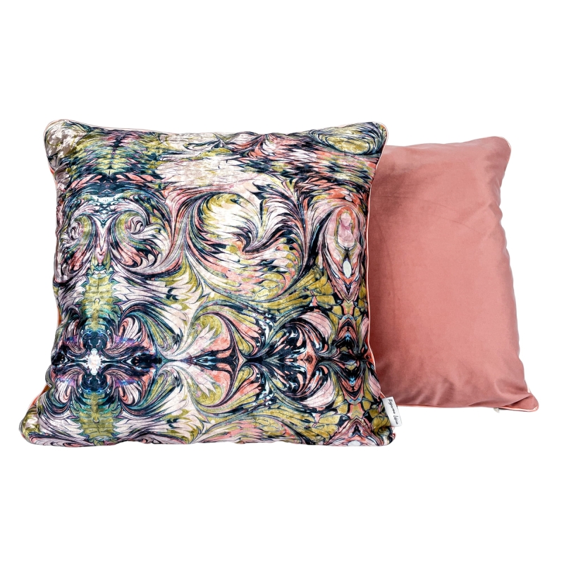 Dwustronna poszewka w odcieniu MONDE łączy abstrakcyjny, wielokolorowy wzór z gładką tkaniną welurową w stonowanym odcieniu brudnego różu. To mocny akcent, który wprowadzi do Twojego wnętrza kolor i energię.