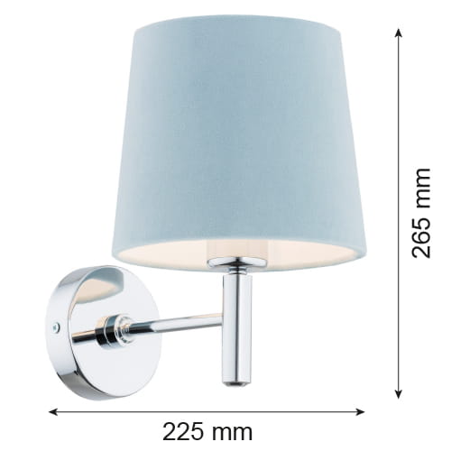 Kinkiet BOLZANO to świetna propozycja dla miłośników srebrnych dodatków we wnętrzach. Prosta, ponadczasowa konstrukcja została wykonana z chromowanej stali, wprowadzającej do wnętrza elegancką świeżość. Całość świetnie uzupełnia stożkowy abażur z aksamitnego weluru w kolorze błękitnym, zapewniający przyjemne światło.