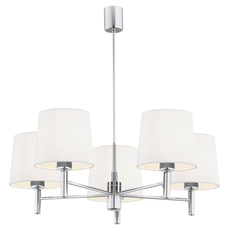 Żyrandol BOLZANO to świetna propozycja dla miłośników srebrnych dodatków we wnętrzach. Prosta, ponadczasowa konstrukcja z 5 punktami świetlnymi została wykonana z chromowanej stali. Błyszczące, chromowane elementy wprowadzają do wnętrza elegancką świeżość. Całość świetnie uzupełniają stożkowe abażury z aksamitnego weluru w kolorze śmietankowym, zapewniające przyjemne światło.