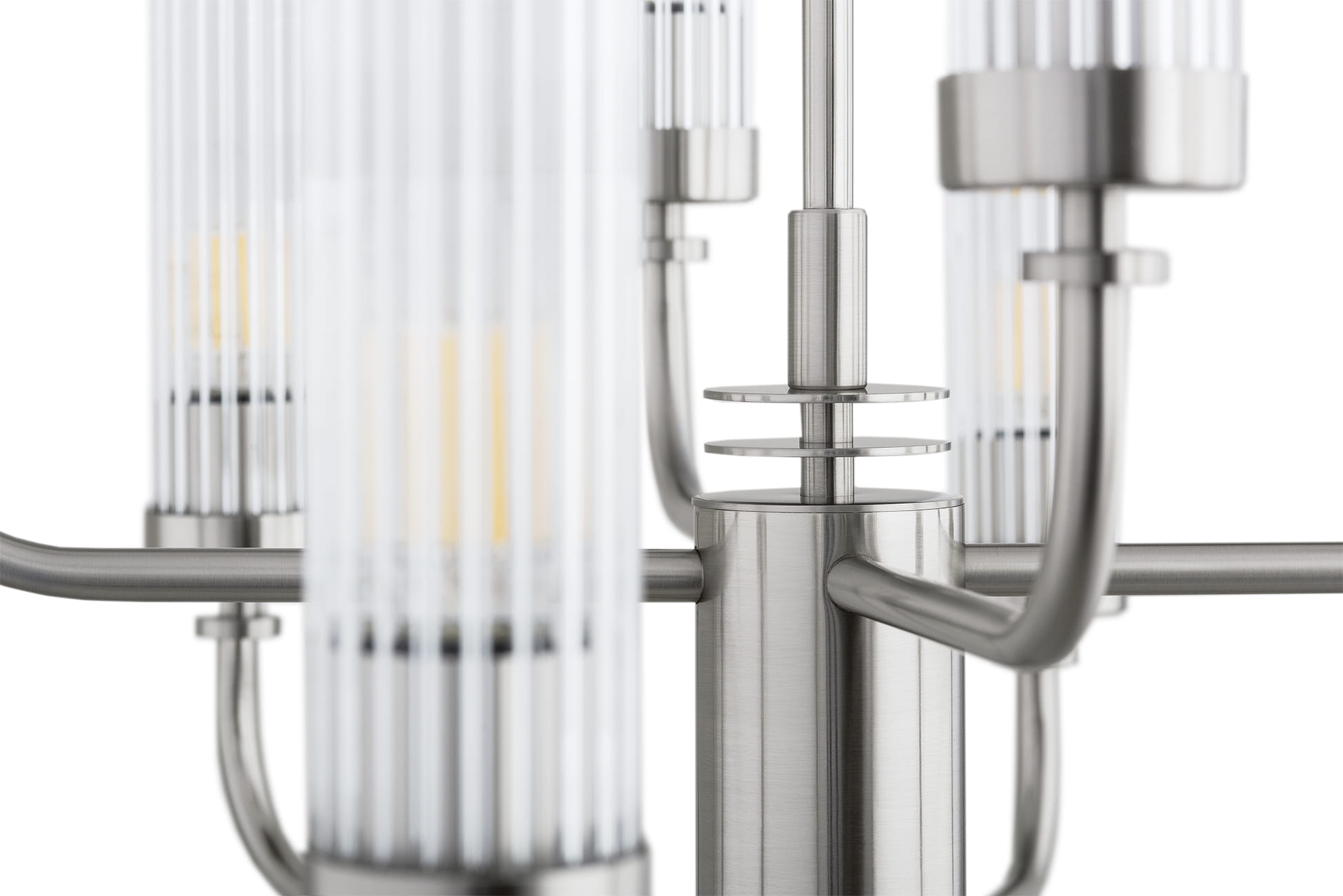 Lampy z kolekcji PRESTON wyróżniają się dekoracyjną formą w klasycznym stylu oraz ponadczasowymi materiałami. Konstrukcja tego żyrandola zachwyca połączeniem niklowanej stali w szczotkowanym wykończeniu z ryflowanym szkłem, podkreślającym elegancki charakter tego projektu. Duży, dwunastoramienny żyrandol PRESTON będzie niezwykle dekoracyjnym, a jednocześnie funkcjonalnym oświetleniem w każdej przestrzeni, w której się znajdzie.