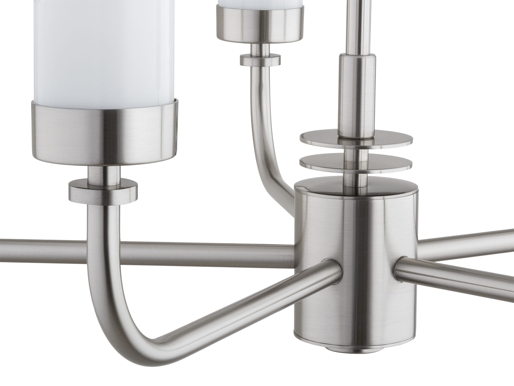 Lampy z kolekcji PRESTON wyróżniają się dekoracyjną formą w klasycznym stylu oraz ponadczasowymi materiałami. Konstrukcja tego żyrandola zachwyca połączeniem niklowanej stali w szczotkowanym wykończeniu z mlecznym szkłem, zapewniającym miękkie światło. Pięcioramienny żyrandol PRESTON będzie niezwykle dekoracyjnym, a jednocześnie funkcjonalnym oświetleniem w każdej przestrzeni, w której się znajdzie.