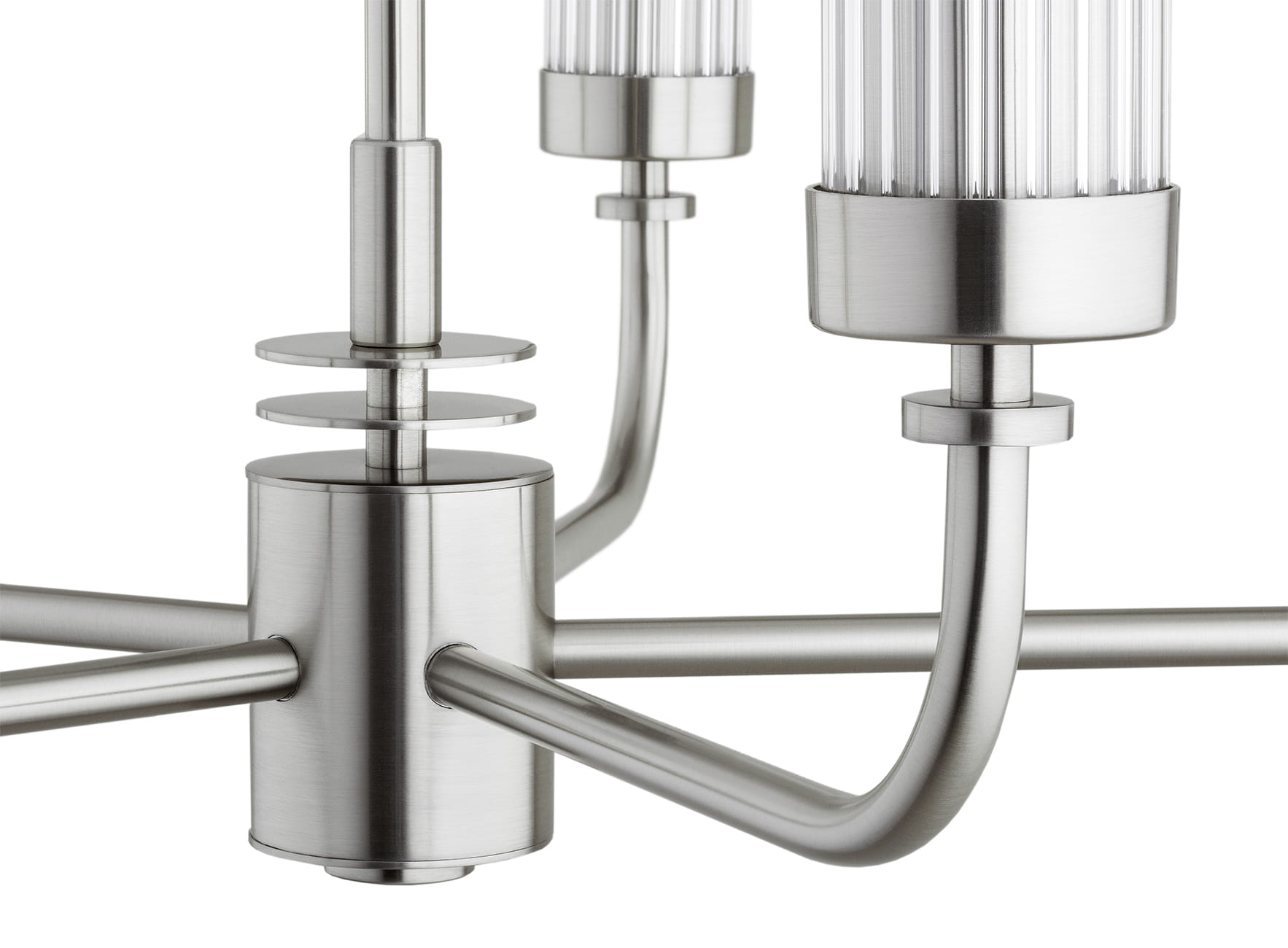 Lampy z kolekcji PRESTON wyróżniają się dekoracyjną formą w klasycznym stylu oraz ponadczasowymi materiałami. Konstrukcja tego żyrandola zachwyca połączeniem niklowanej stali w szczotkowanym wykończeniu z ryflowanym szkłem, podkreślającym elegancki charakter tego projektu. Pięcioramienny żyrandol PRESTON będzie niezwykle dekoracyjnym, a jednocześnie funkcjonalnym oświetleniem w każdej przestrzeni, w której się znajdzie.