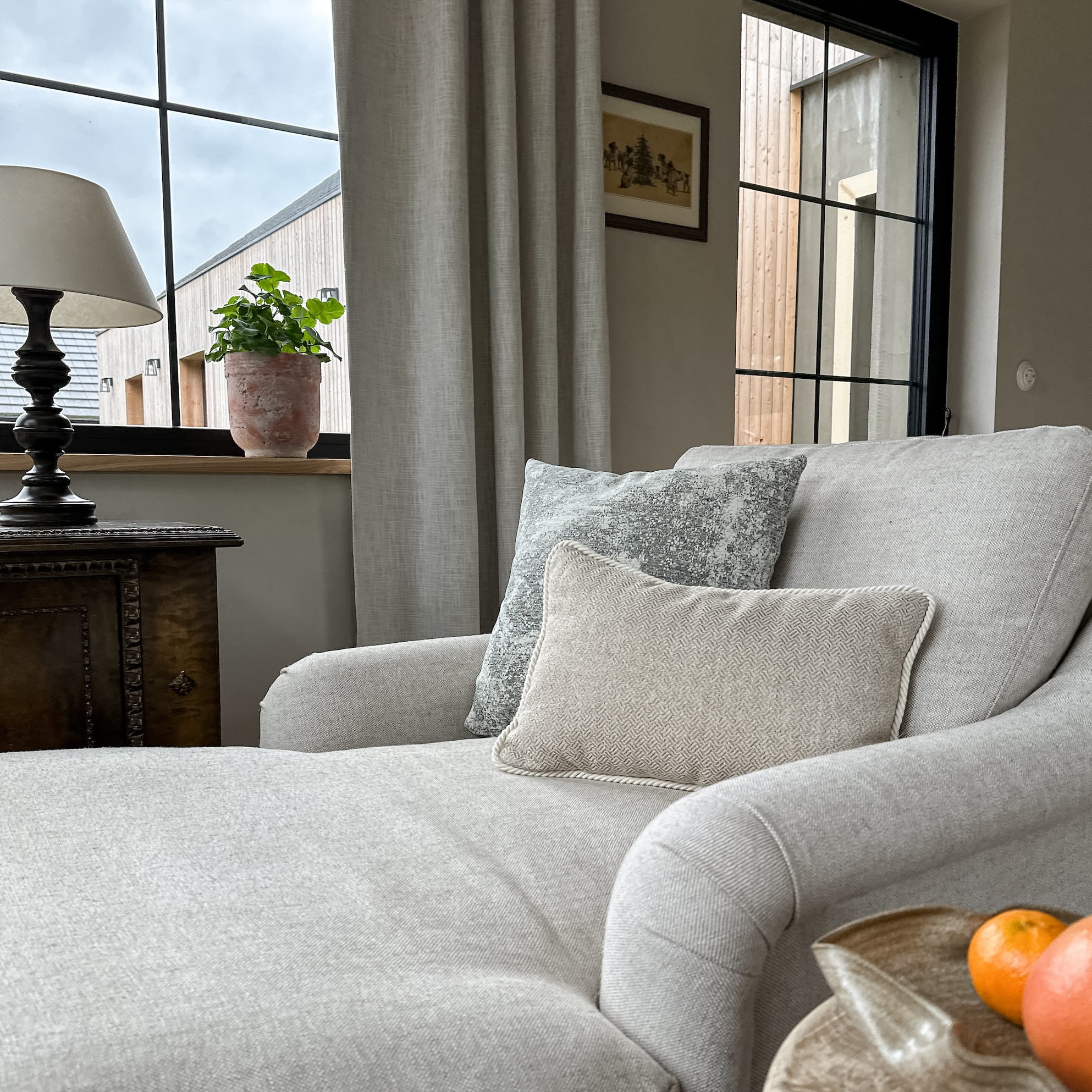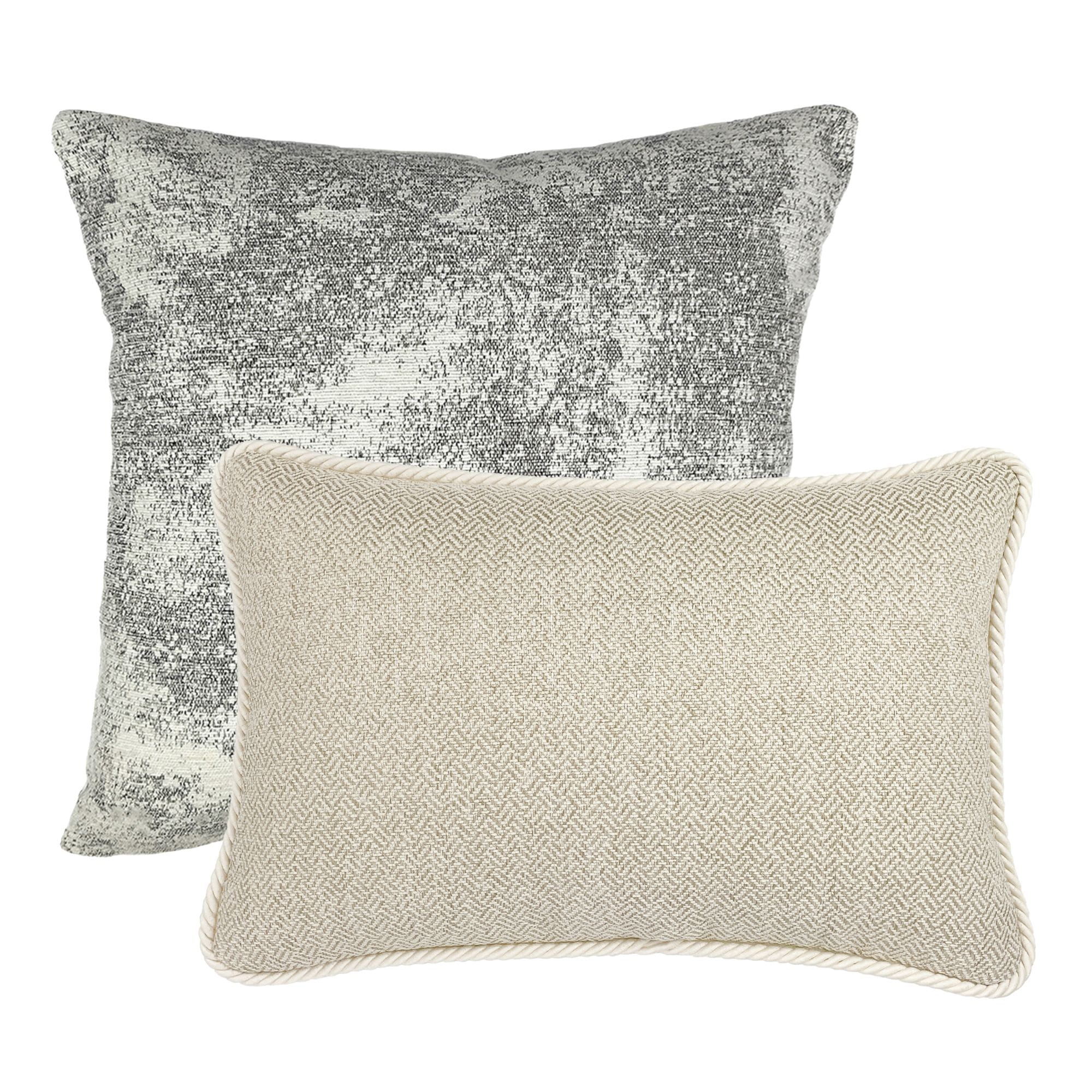 Szaro-beżowy zestaw poszewek No. 26 to delikatna, ponadczasowa kompozycja, a tym samym świetny wybór do wielu wnętrz. Delikatny, nierównomierny wzór na kremowo-szarej poszewce VINTAGE tworzy harmonijny zestaw z żakardową, beżową poszewką GISELLE II. Stonowane kolory i delikatne wzory najwyższej jakości tkanin zapewniają piękną dekorację i komfort wypoczynku. Cały zestaw wprowadzi do każdego wnętrza subtelność i przytulność w eleganckim wydaniu.