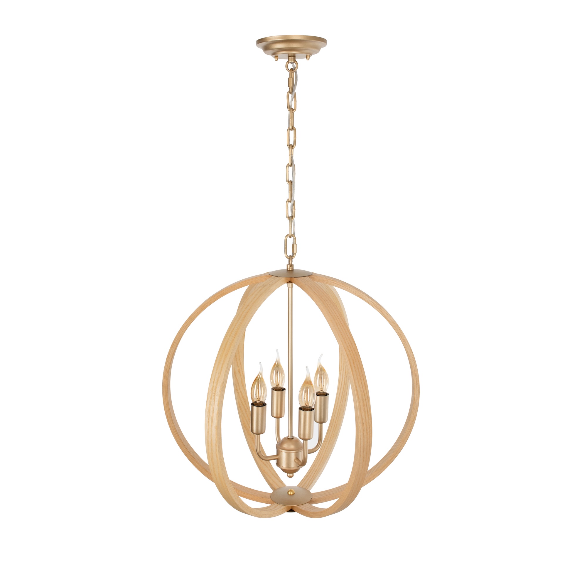 Kulista lampa wisząca MOON wprowadzi do Twojego wnętrza ciepły, rustykalny klimat. Sercem tej lampy jest metalowa konstrukcja z 4 punktami świetlnymi w kształcie nawiązującym do ozdobnych świeczników. Ponadczasowy, stonowany odcień złota nadaje jej nieprzemijającej elegancji. A to nie wszystko, bo w całej konstrukcji znajdziesz wiele dekoracyjnych detali, będących efektem rzemieślniczego wykonania. Całość jest zamknięta w drewnianym kloszu w kształcie kuli, stworzonej z drewnianych, giętych łuków. Dzięki tak ponadczasowemu połączeniu materiałów, to lampa wisząca idealna do wnętrz klasycznych, rustykalnych i stylu farmhouse. Lampa MOON świetnie sprawdzi się jako oświetlenie salonu, kuchni lub sypialni, jak też oświetlenie korytarza, będąc nie tylko funkcjonalna, ale i dekoracyjna.