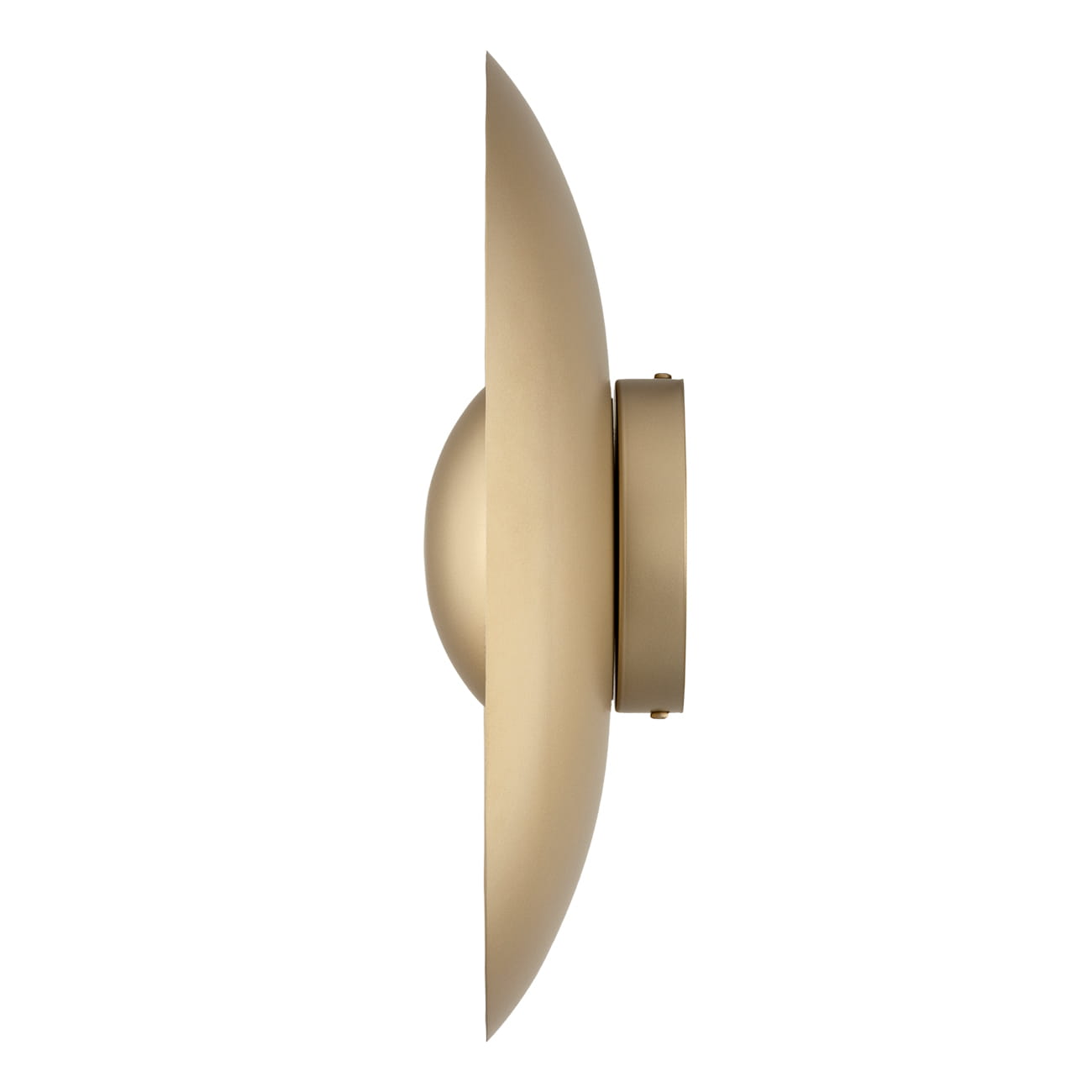- Ozdobny kinkiet w formie dwóch okręgów zwróconych ku sobie, wykonany ze stali w stonowanym odcieniu ciemnego złota.