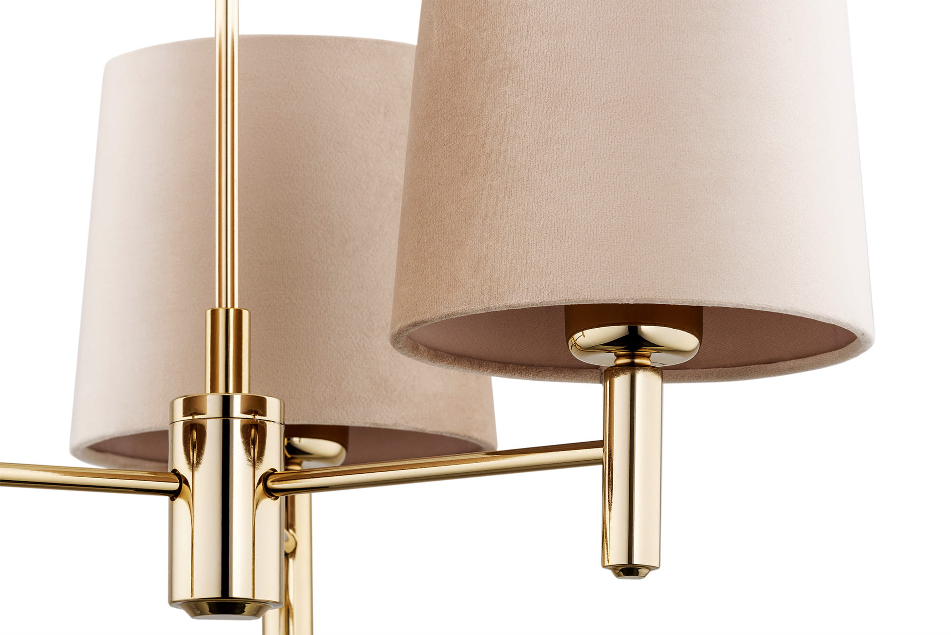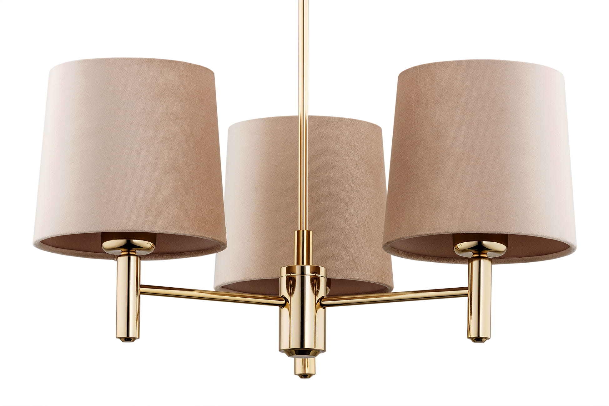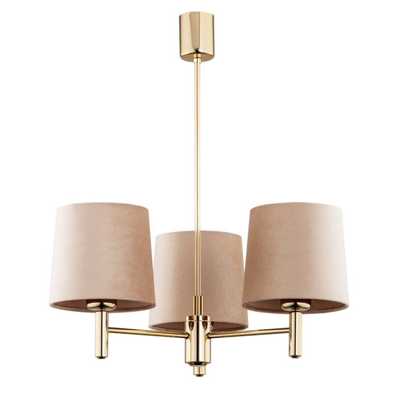 Żyrandol PONTE to świetna propozycja dla miłośników złotych dodatków we wnętrzach. Prosta, ponadczasowa konstrukcja z 3 punktami świetlnymi została wykonana ze stali mosiądzowanej. Błyszczące, złote elementy wprowadzają do wnętrza elegancję i ciepło. Całość świetnie uzupełniają stożkowe abażury z aksamitnego weluru w kolorze beżowym, zapewniające przyjemne światło.