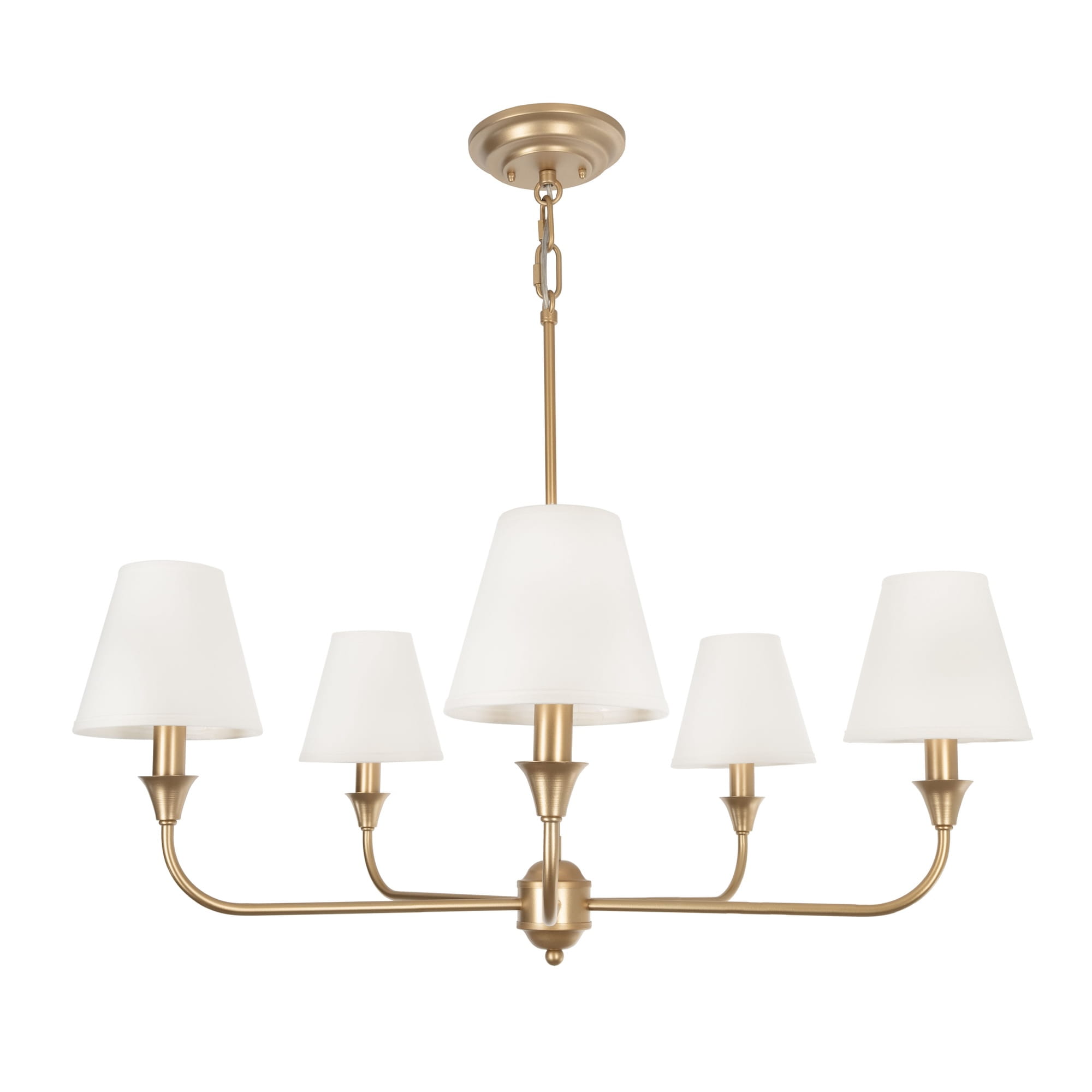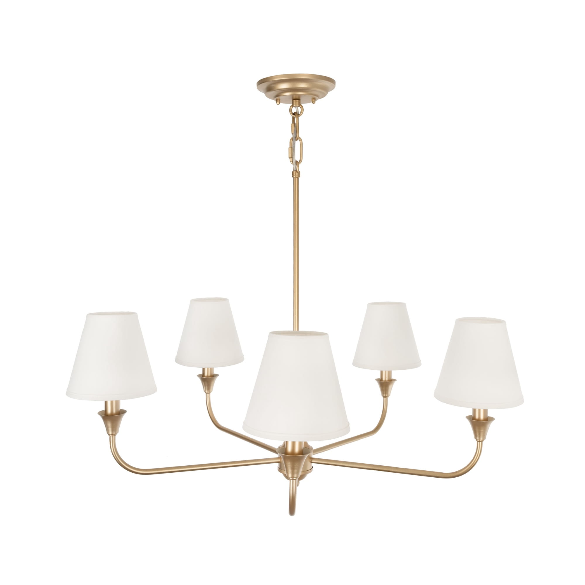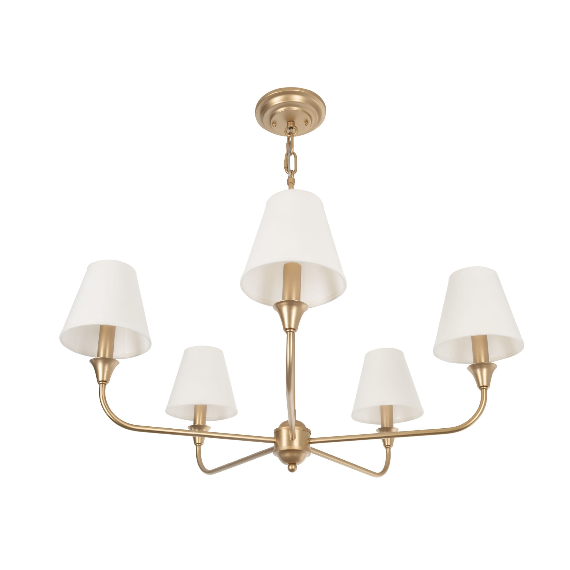 Klasyczny złoty żyrandol z kolekcji CHIC to ponadczasowy wybór głównego oświetlenia. 5 punktów świetlnych przypomina formą ozdobne świeczniki, co możesz podkreślić przez wybór żarówek przypominających płomyk świecy. W połączeniu z abażurami (dostępnymi w dwóch kolorach), żyrandol zapewnia miękkie światło. Subtelną, złotą konstrukcję wieńczy ozdobne zawieszenie z metalową rurką, skrywającą przewód.