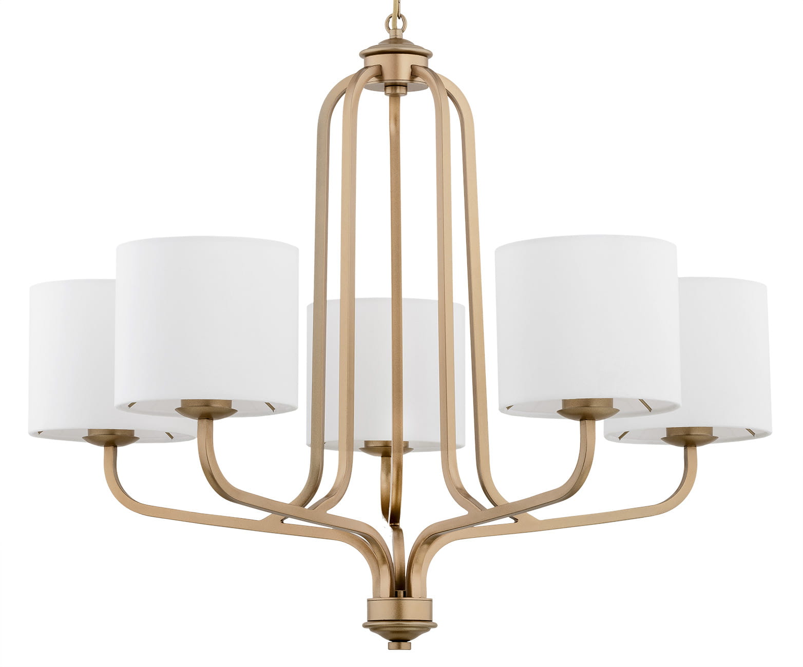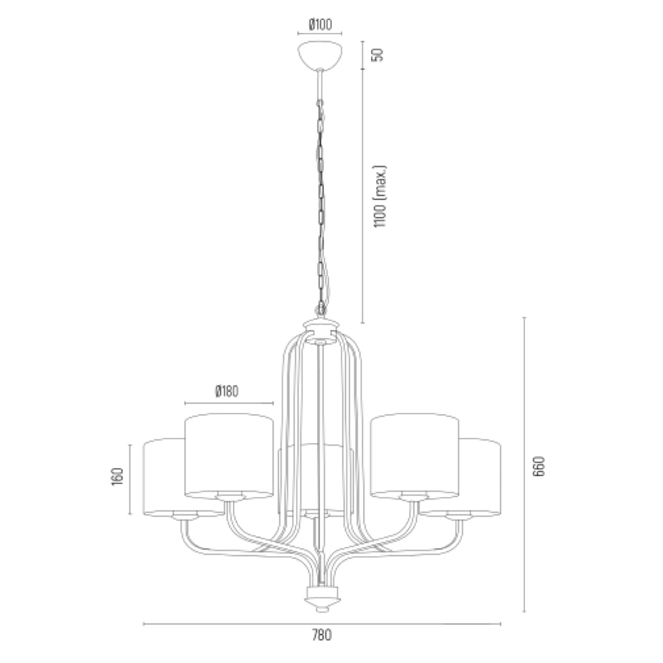 Żyrandol MARANELLO jest jak wnętrzarska biżuteria - ozdobi każdą przestrzeń, zapewniając przy tym przyjemne, zmiękczone światło. W centrum żyrandola znajduje się zachwycająca, metalowa konstrukcja, pełna wytwornych detali. Gięte, opływowe elementy podkreślają elegancję i harmonię tego projektu. Warto zwrócić uwagę również na odcień metalowej konstrukcji. Stonowany odcień tzw. "starego złota" wyróżnia się subtelnym, satynowym wykończeniem, dzięki czemu jest niesamowicie ponadczasowy. Całość świetnie uzupełniają białe abażury w cylindrycznym kształcie, zapewniające przyjemne, miękkie światło.